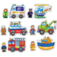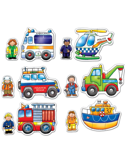 Пъзел, състоящ се от спасители и техните превозни средства! Сравнете парчетата и намерете линейка, планинска кола, полицейски хеликоптер, камион за теглене, пожарна кола и спасителна лодка!