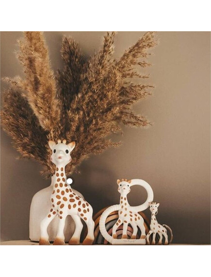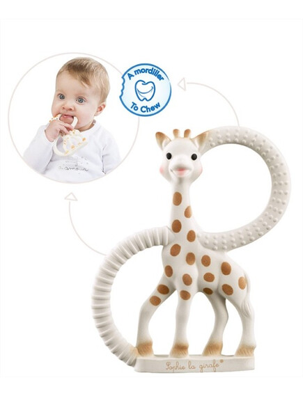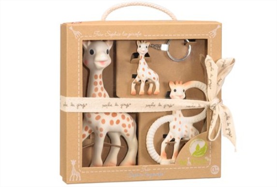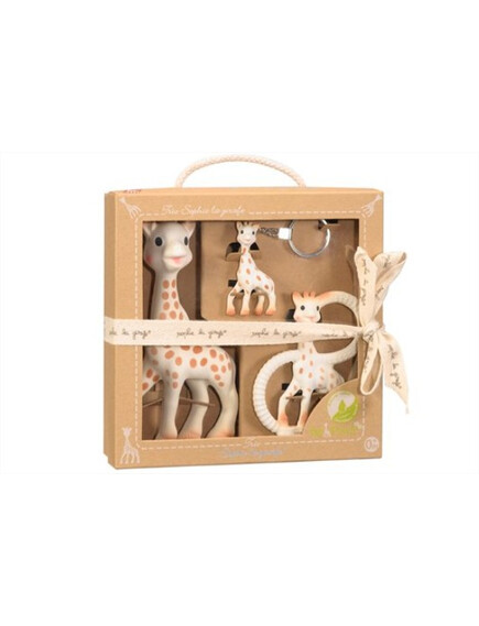 Подаръчният комплект "Софи жирафчето-Трио" е идеален за подарък, защото всички продукти, които съдържа са изработени от 100% естествен каучук и облекчават болезнените венци. Включва: