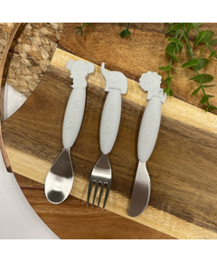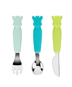 Виличка, ножче и лъжичка със силиконова дръжка и дизайн с различни животни.  С този сет, детето ще се научи да се храни самостоятелно и да използва правилно прибори.    Характеристики: Мека силиконова дръжка за лесно хващане.  3 броя в сет....