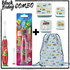 BF Combo за малък герой: Brush Baby Ел. четка за зъби 3+ години "Динозавър" + 4 броя кутии за храна + Мешка в дизайн по избор