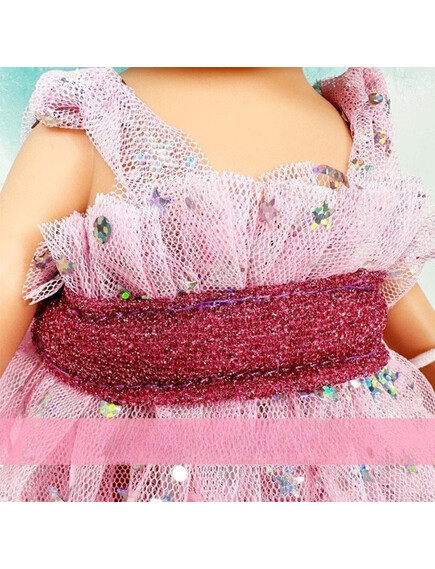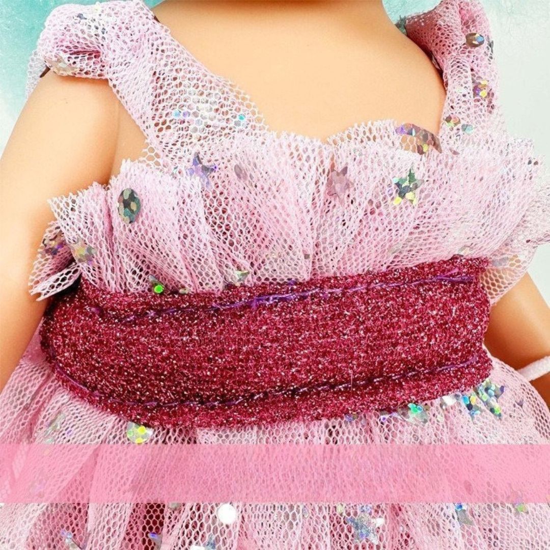 С голяма, къдрава косакато захарен памук, розова, блестяща рокличка, розови сандалки и панделка!