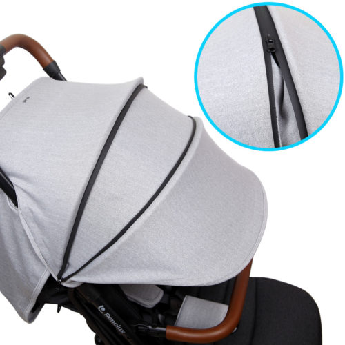 - Широк регулируем сенник с цип, водоустойчив и с максимална слънцезащита UPF 50+