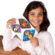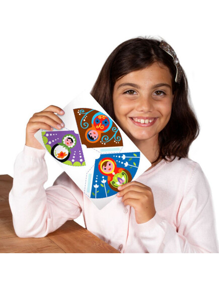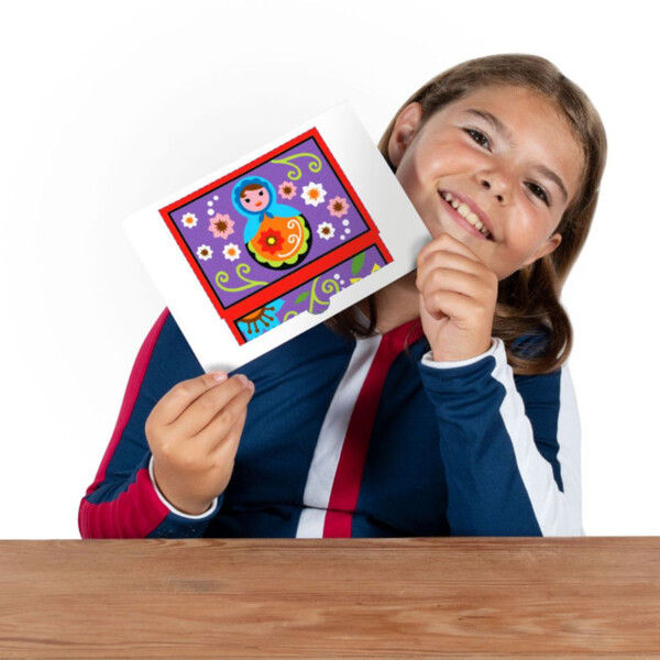 След като оцветите картите, следвайки инструкциите, сглобете комплекта с помощта на самозалепващите елементи на листите, без ножици и лепило. Страхотна ръчно изработена идея за подарък!