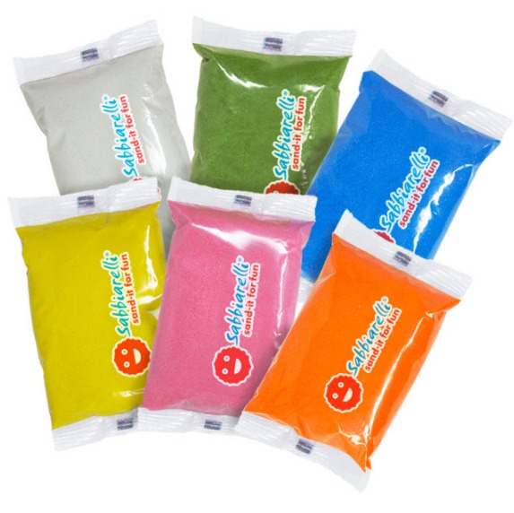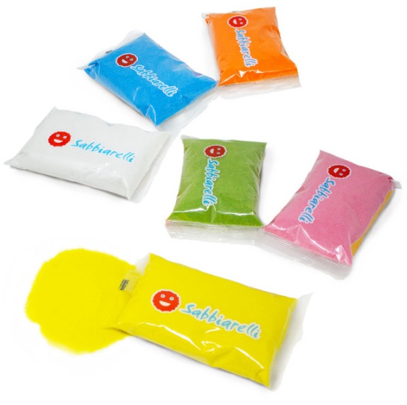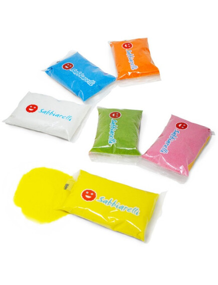 Съдържа 6 броя пясъчни пълнителя(торбички) за маркер Sabbiarelli® във всички светли цветове на марката;