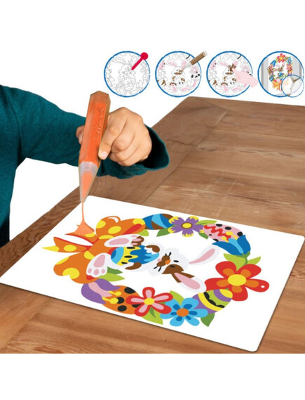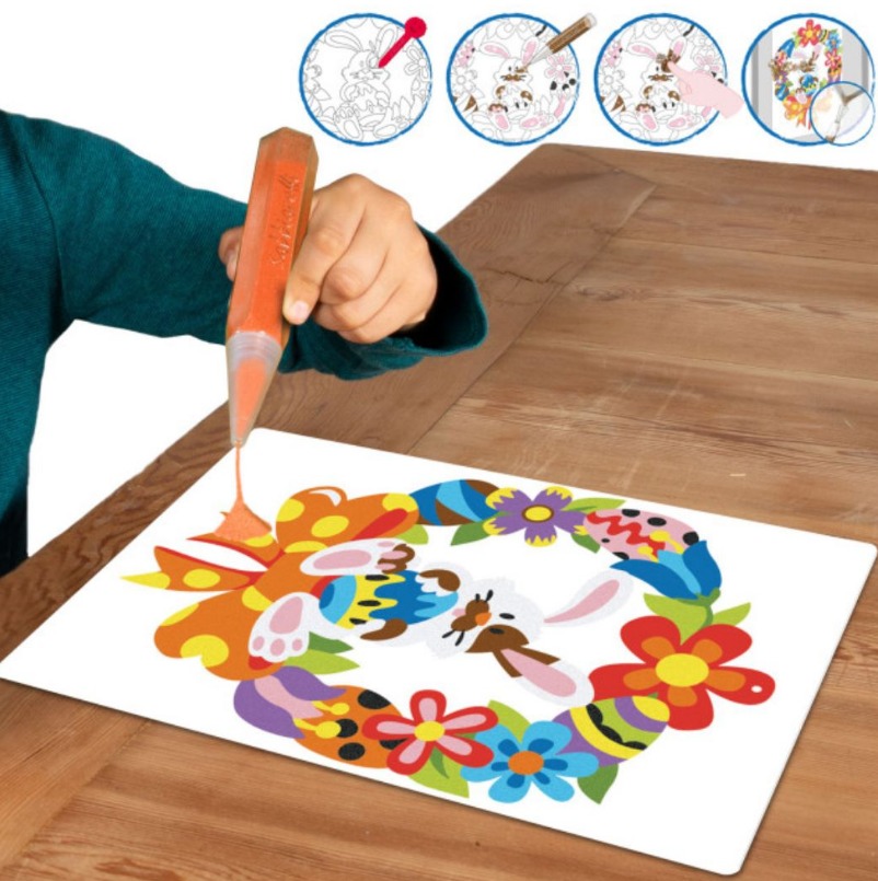 Няма нужда от ножици и лепило! Просто отлепете и оцветете с цветния пясък.