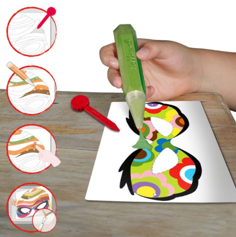 Няма нужда от ножици и лепило! Премахвайки хартията от листовете, залепващата повърхност остава оцветена с пясък.