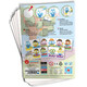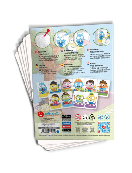 Книжката съдържа 5 листа (15х20см) самозалепваща се хартия с 10 фигурки, изобразяващи щастливи великденски яйца, готови за боядисване с пясък.