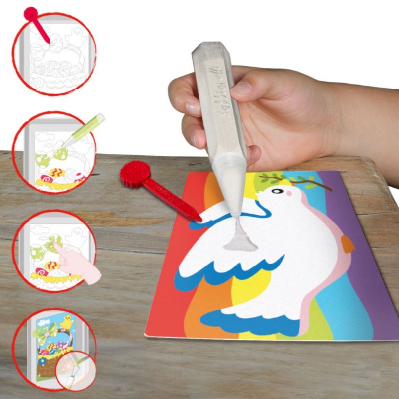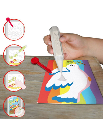 Няма нужда от ножици и лепило! Премахвайки хартията от листовете, залепващата повърхност остава оцветена с пясък.
