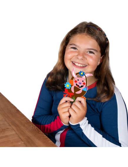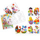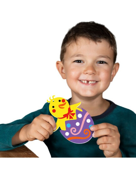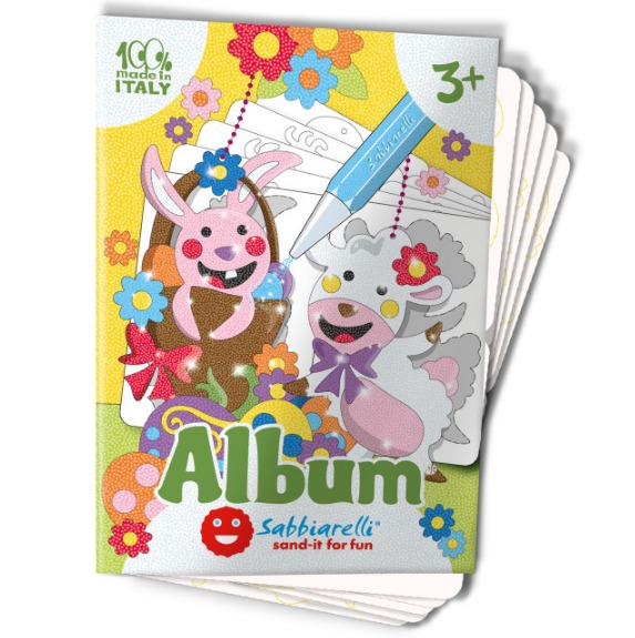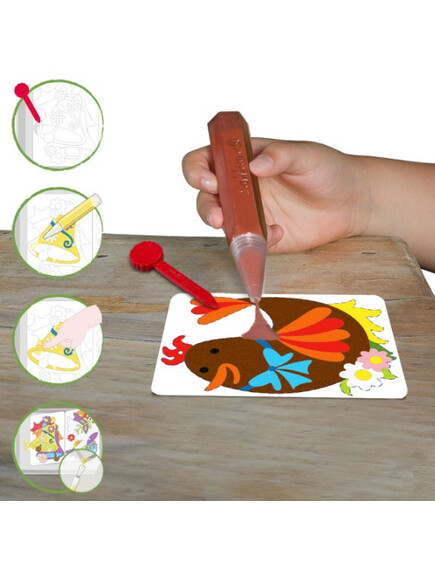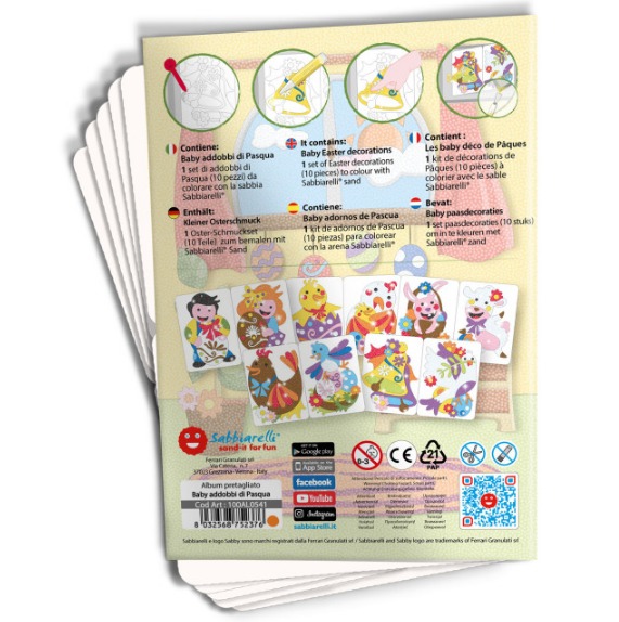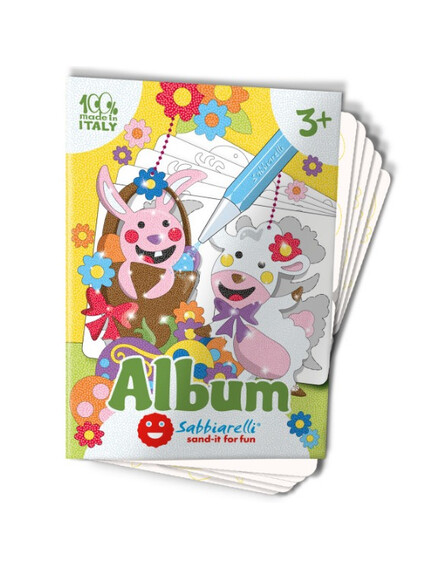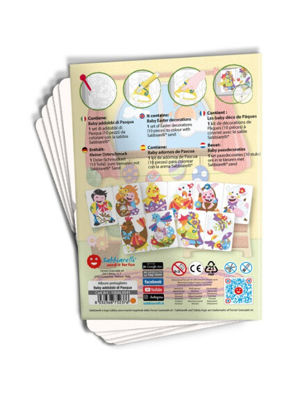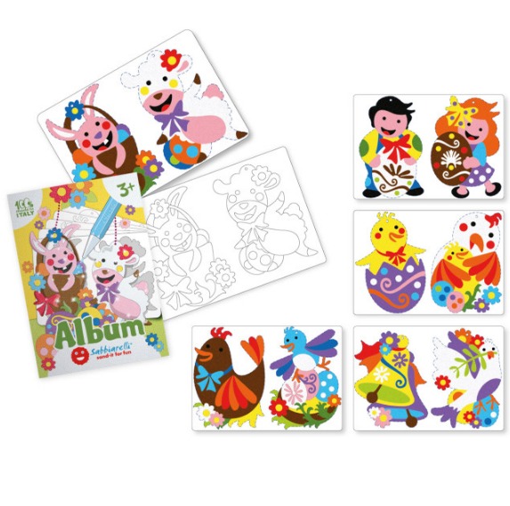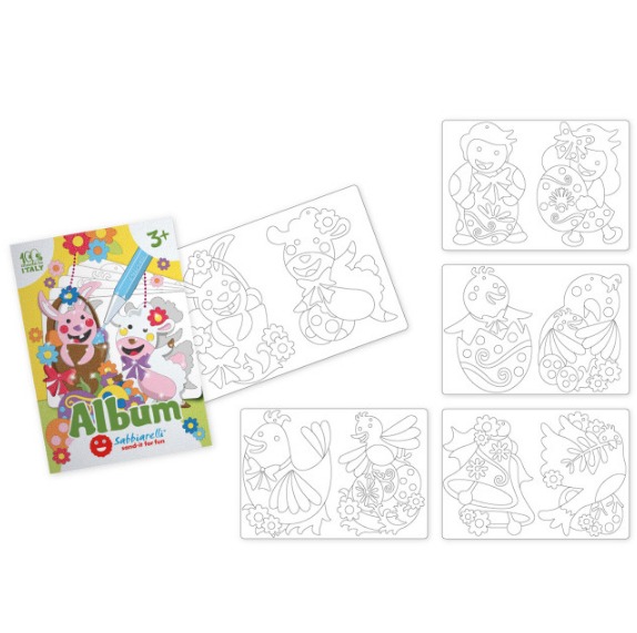 Книжката съдържа 5 листа (15х20см) самозалепваща се хартия изобразяваща великденски рисунки, готови за оцветяване с пясък.