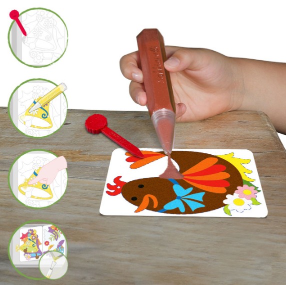 Няма нужда от ножици и лепило! Просто отлепете и оцветете с цветния пясък.