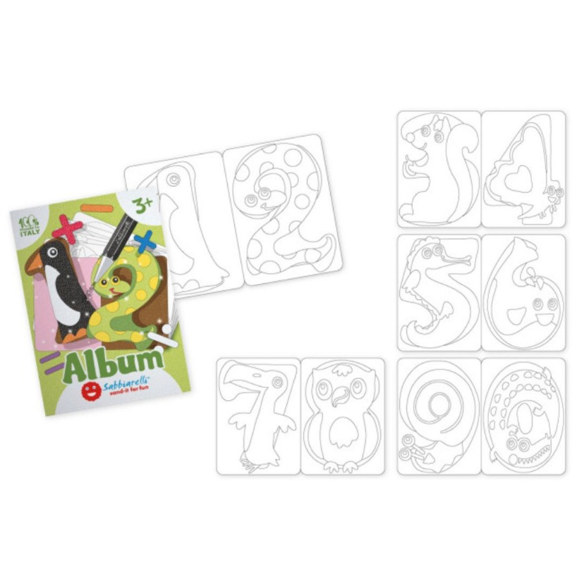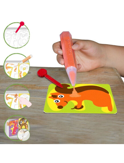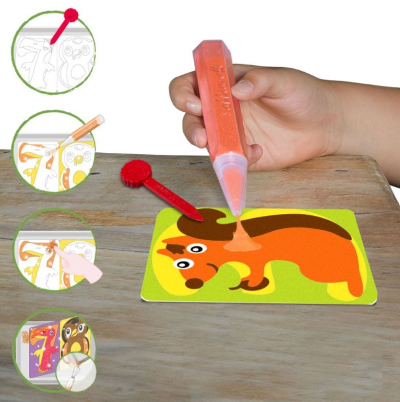 Няма нужда от ножици и лепило! Премахвайки хартията от листовете, залепващата повърхност остава оцветена с пясък.