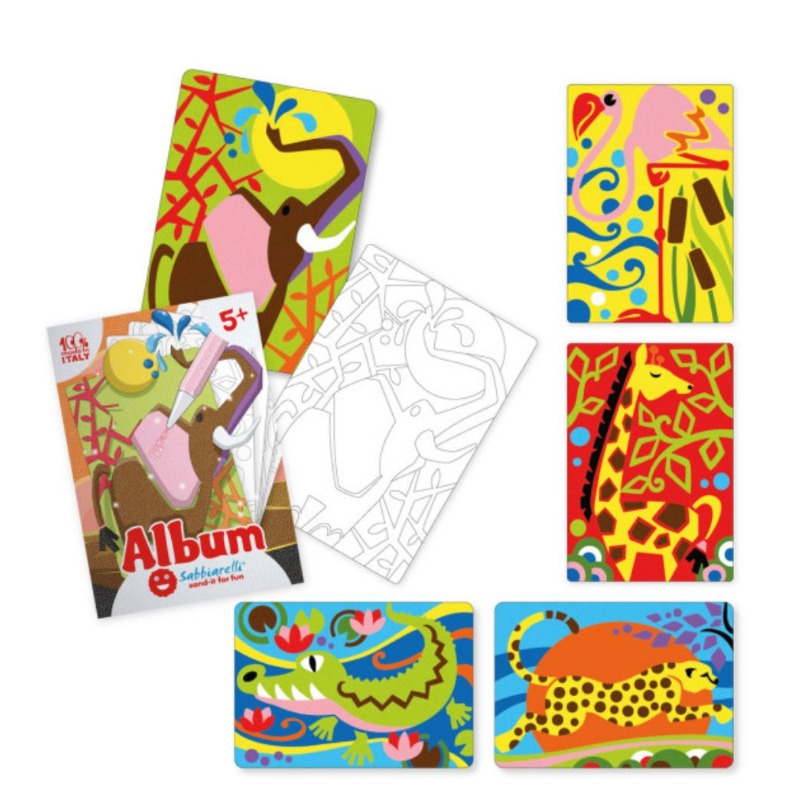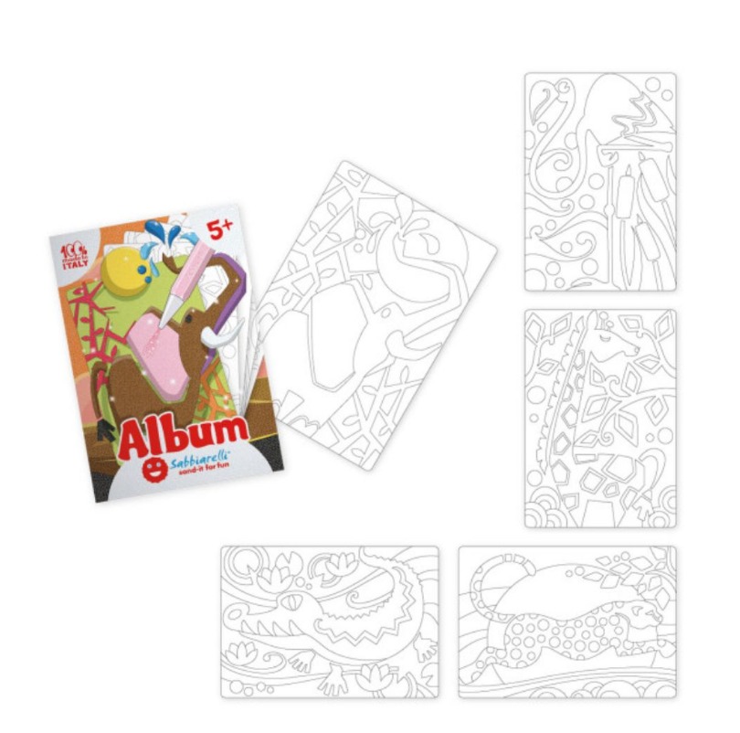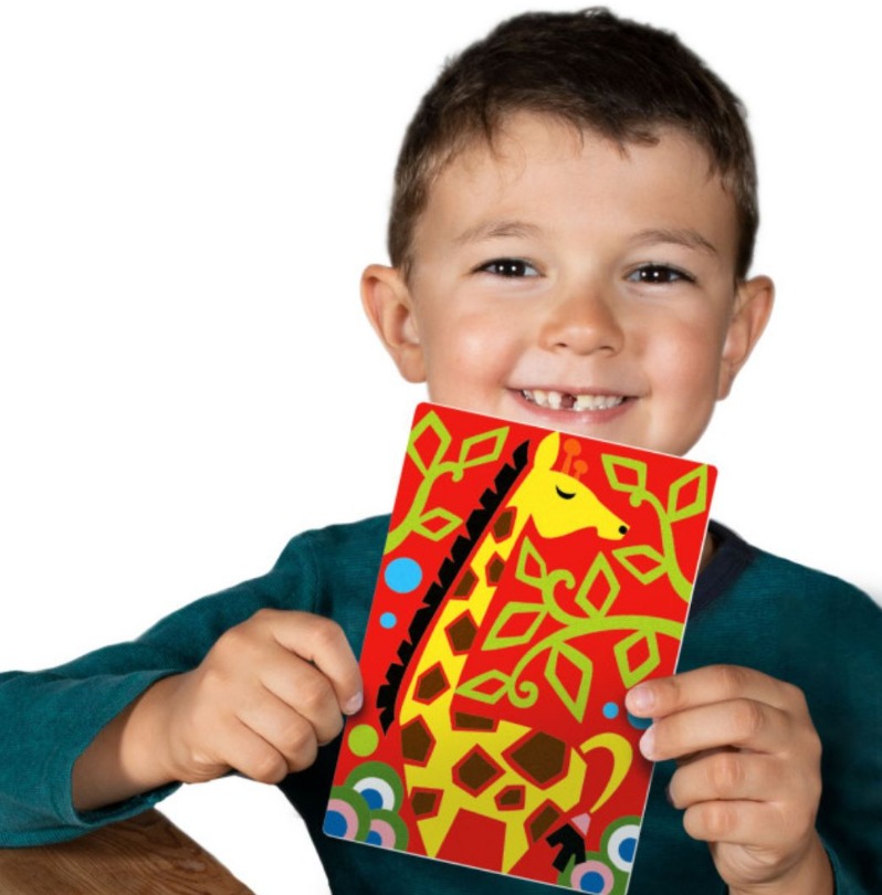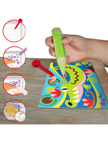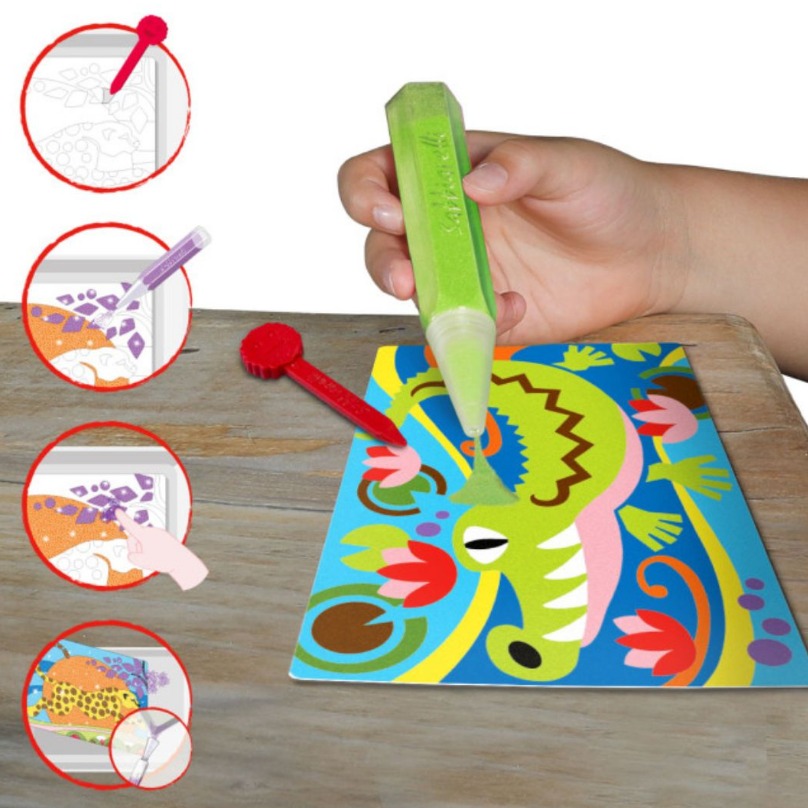 Няма нужда от ножици и лепило! Премахвайки хартията от листовете, залепващата повърхност остава оцветена с пясък.