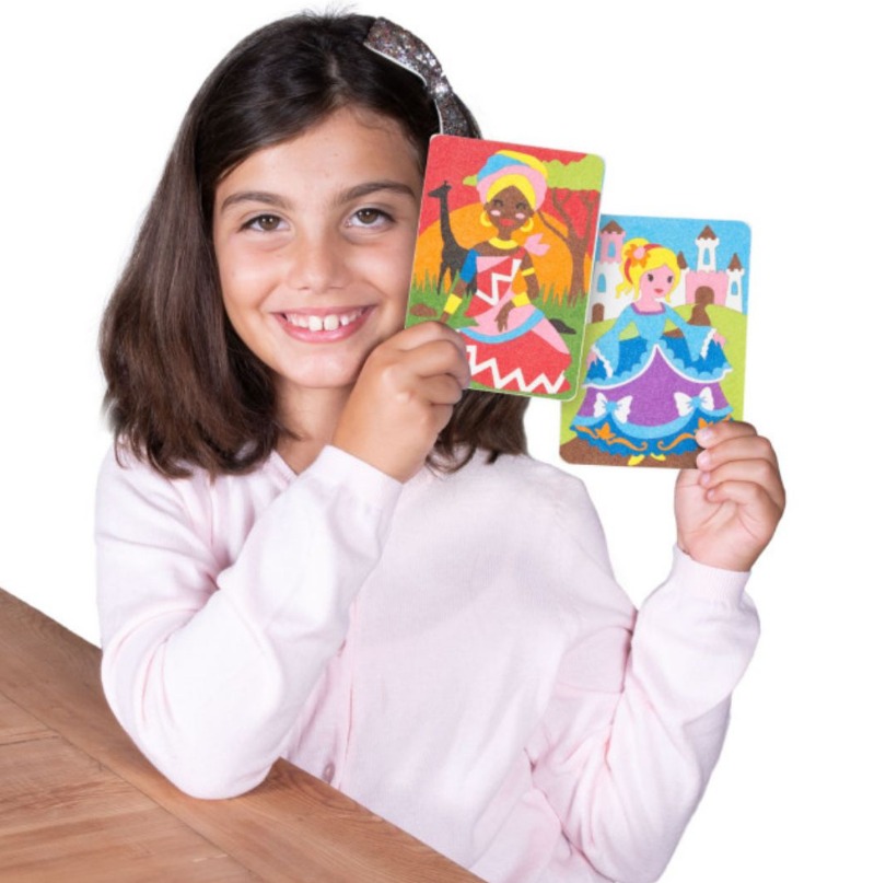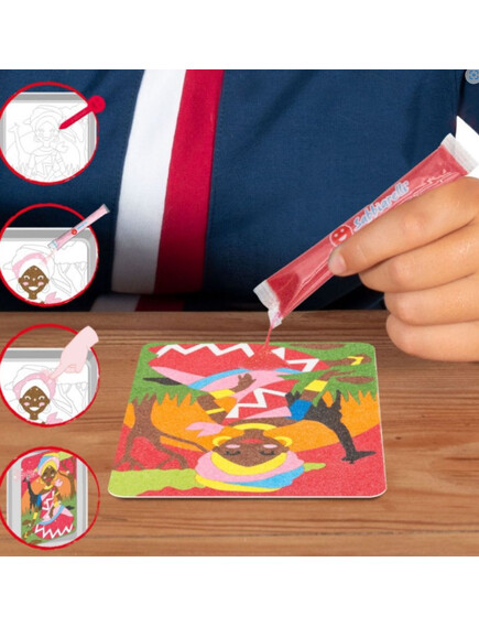 Няма нужда от ножици и лепило! Просто отлепете и оцветете с цветния пясък.