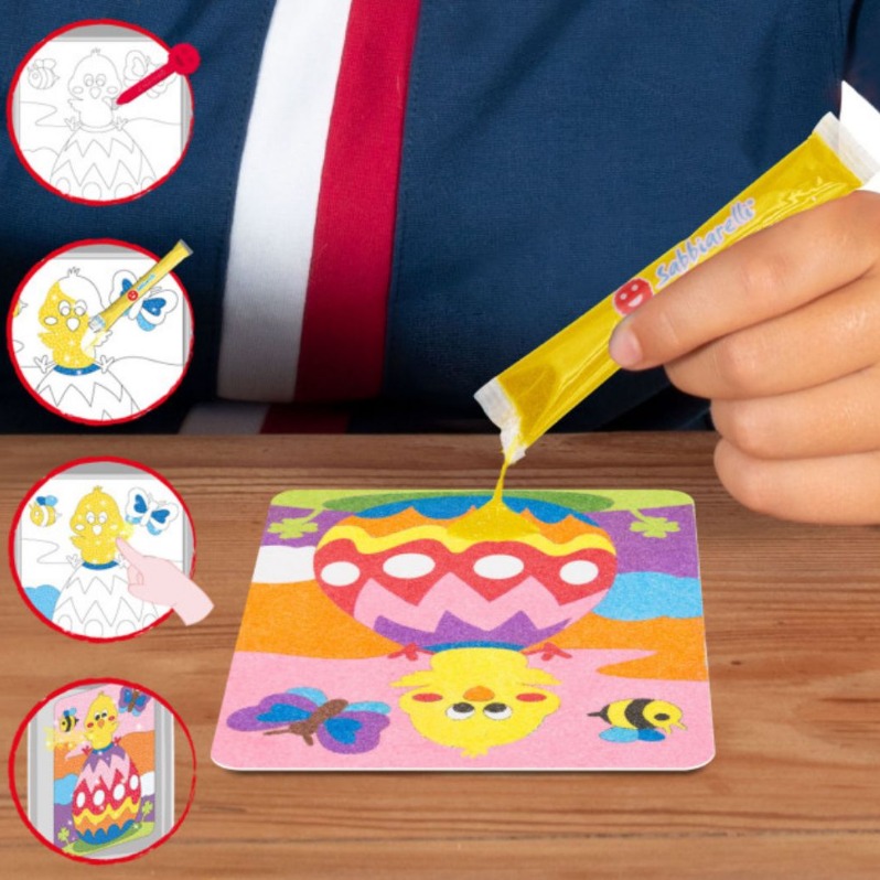 Sabbiarelli® са специални сашета, съдържащи ярко оцветен и нетоксичен мраморен пясък от Карара. Те са изработени от устойчиви рециклирани материали и насърчават сръчността при по-малките деца и концентрацията при по-големите.