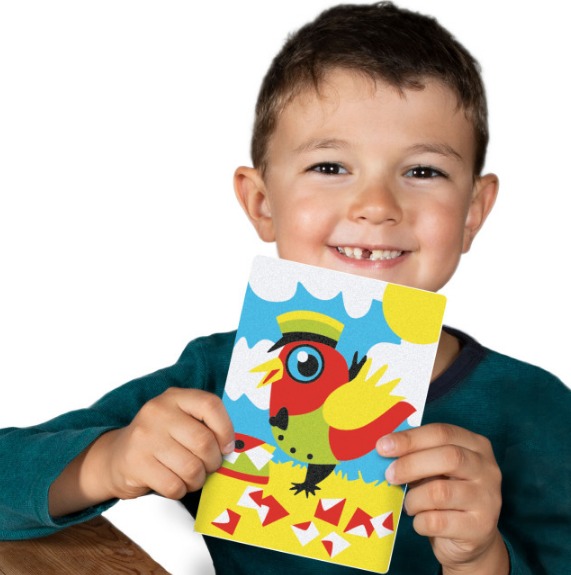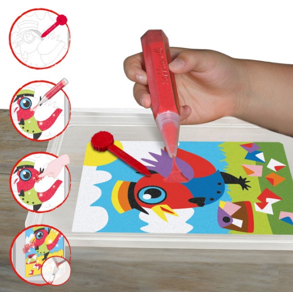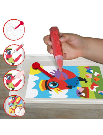 Няма нужда от ножици и лепило! Просто отлепете и оцветете с цветния пясък.