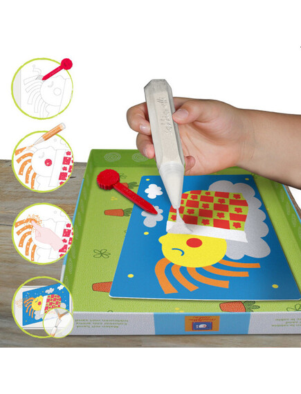 Комплектът включва - 8 пясъчни маркера, 7 шаблона, 1 шпатулка за премахване на стикери, 1 табла, книжка с инструкции;