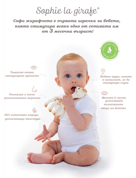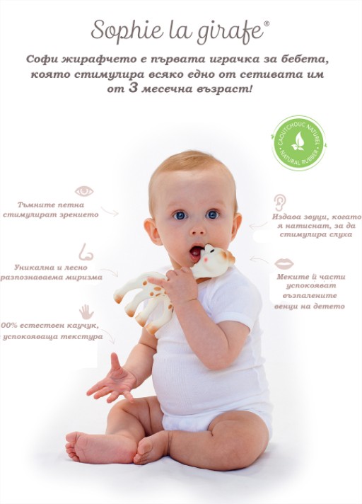 - Жирафчето Софи - първата и любима на всички бебета по света играчка, която стимулира всички техни сетива! Изработена от 100% естествен каучук, пръв помощник в облекчаването на болезнените венци, когато зъбките започнат да растат!