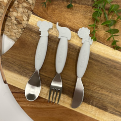 Виличка, ножче и лъжичка със силиконова дръжка и дизайн с различни животни.  С този сет, детето ще се научи да се храни самостоятелно и да използва правилно прибори.    Характеристики: Мека силиконова дръжка за лесно хващане.  3 броя в сет....