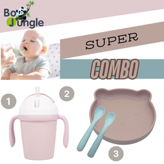 Три от най-нужните продукти на едно място в едно страхотно комбо за лесно хапване от Bo Jungle!  В комбото ще откриете :  1. Силиконова чинийка с вакуум Чинийка за хранене със здрава засмукваща подложка, така че Вашето бебе да не може да блъсне храната си....