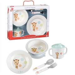 Бебето може да започне да се храни като голямо момче или момиче благодарение на този сет! Комплектът включва: плитка чиния купичка комплект вилица и лъжица чаша Позволено е миенето в съдомиялна до 60 градуса! Да не се стерилизира.