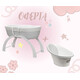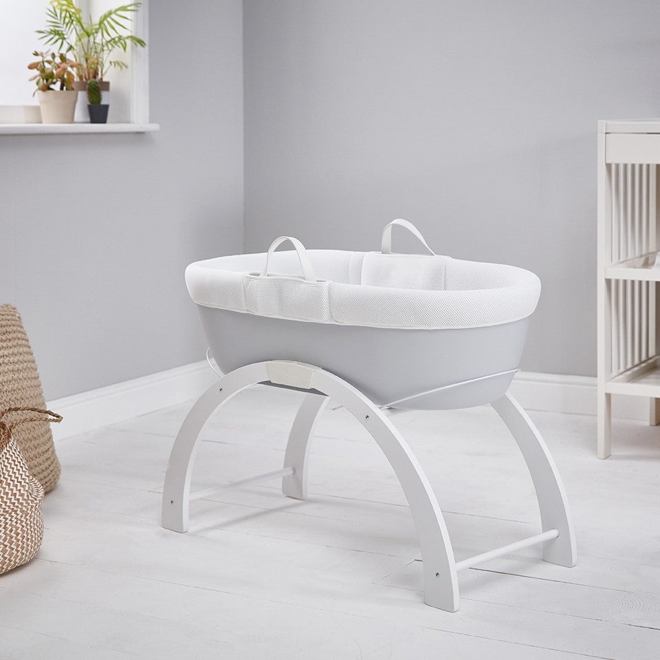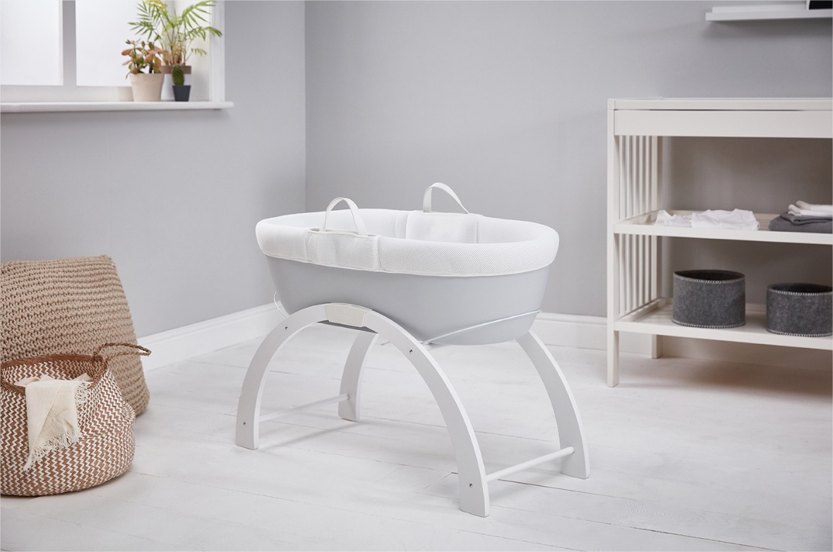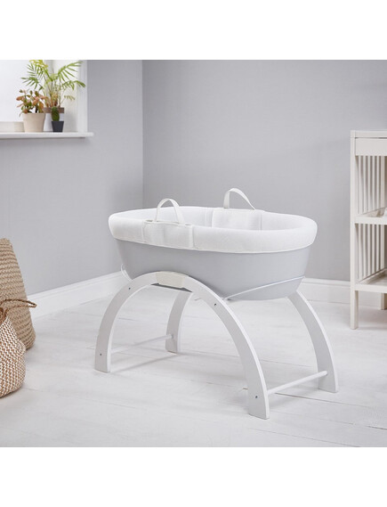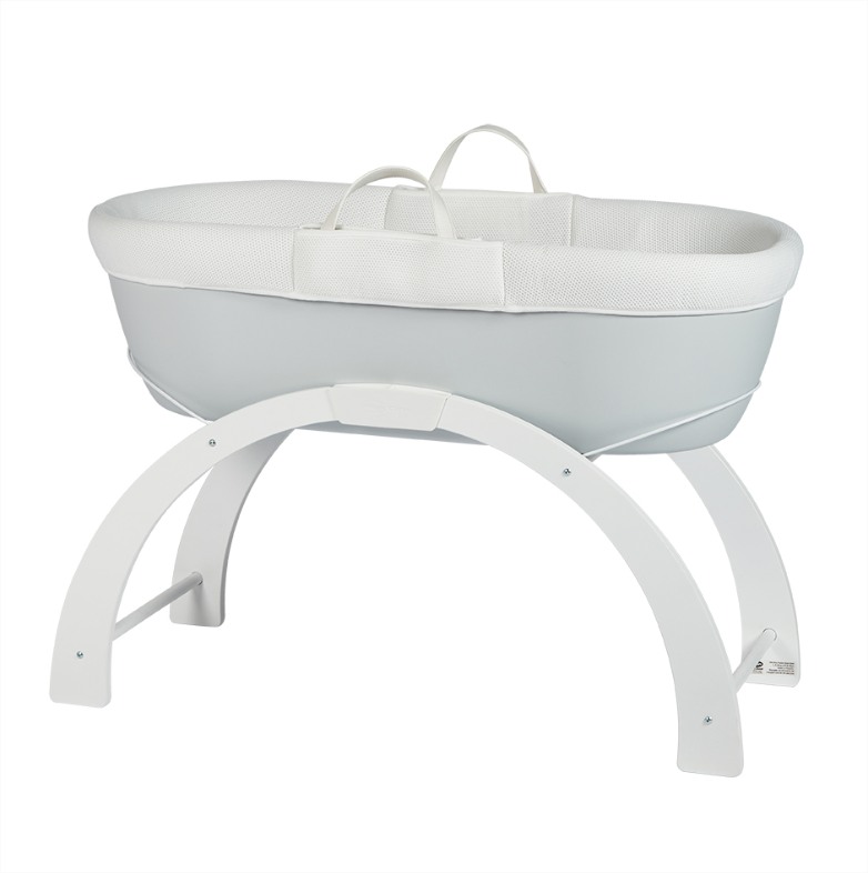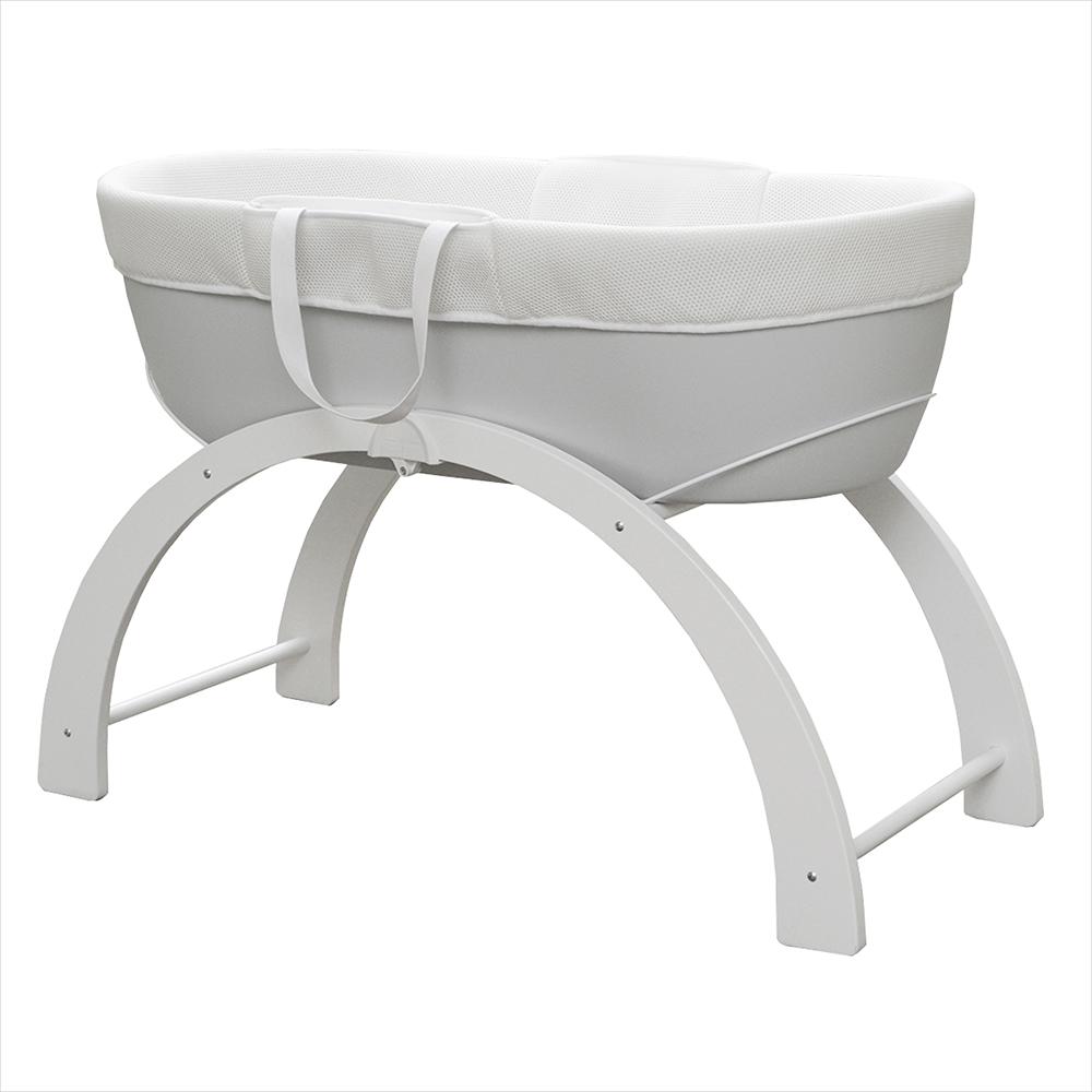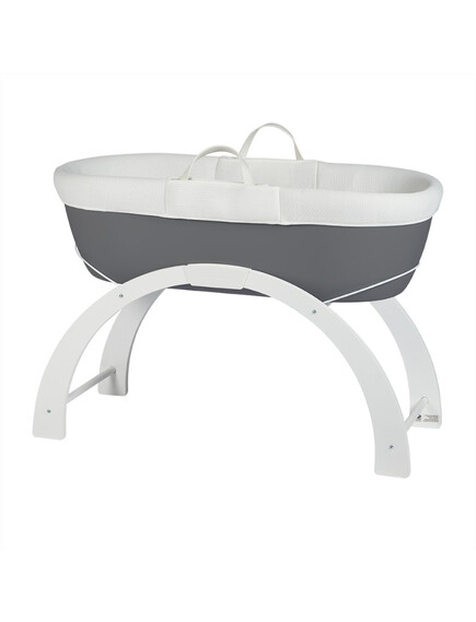- Включен в комплекта на кошницата е луксозен ватиран матрак и бяла дървена стойка с две позиции: люлка на ниско ниво или фиксирана позиция на високо ниво.
