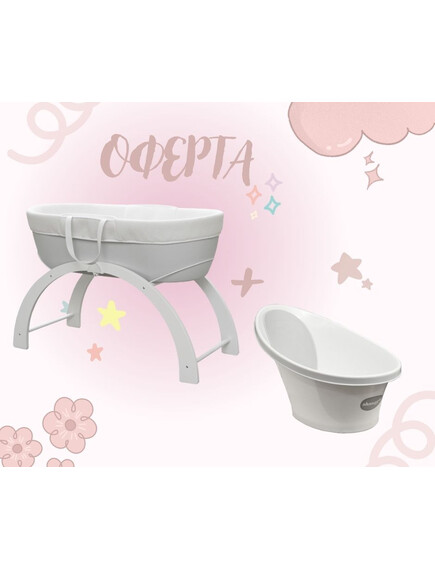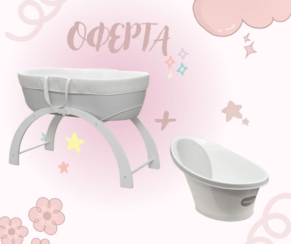 В тази оферта може да комбинирате двата най-необходими продукта за бебето: кош за сън и вана за къпане, от многократно награждаваната марка Shnuggle. В офертата са комбинирани светло сив кош и бяла вана, но вие може да уточните и промените комбинацията СПРЯМО НАШАТА НАЛИЧНОСТ, при направена поръчка на телефона посочен в сайта ни.