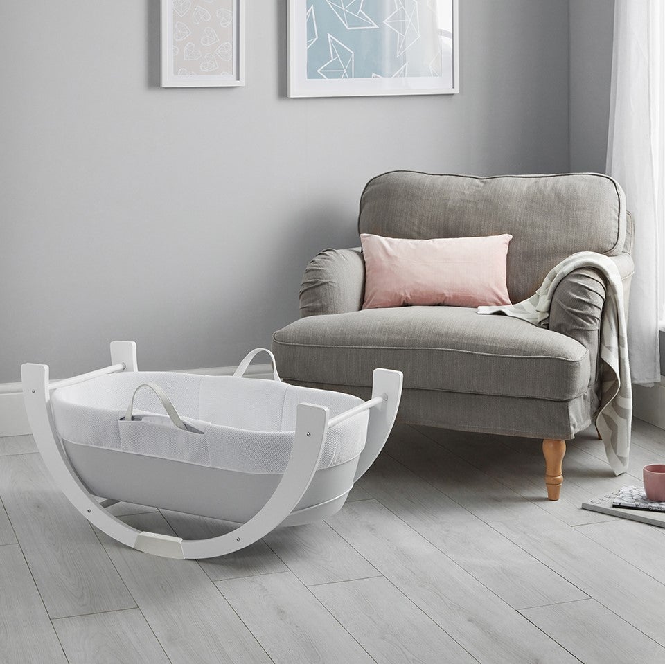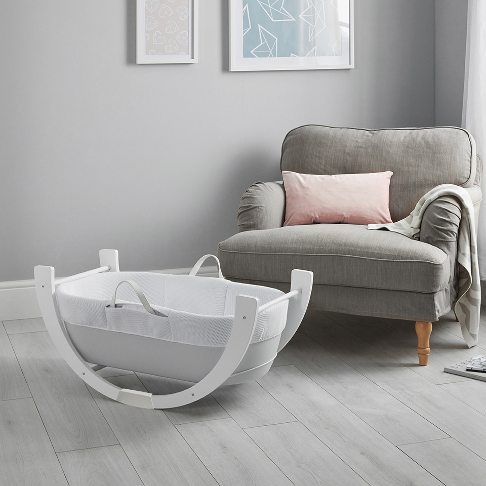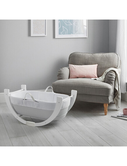 Иновативна алтернатива на традиционния кош с проветрива, хипоалергенна, дишаща материя, луксозен ватиран матрак и двупозиционна стойка за леко люлеене на ниско ниво или фиксирана позиция на високото ниво. Кошницата Shnuggle Dreami® е лесна за местене из дома, за да държи бебето близо до Вас ден и нощ.