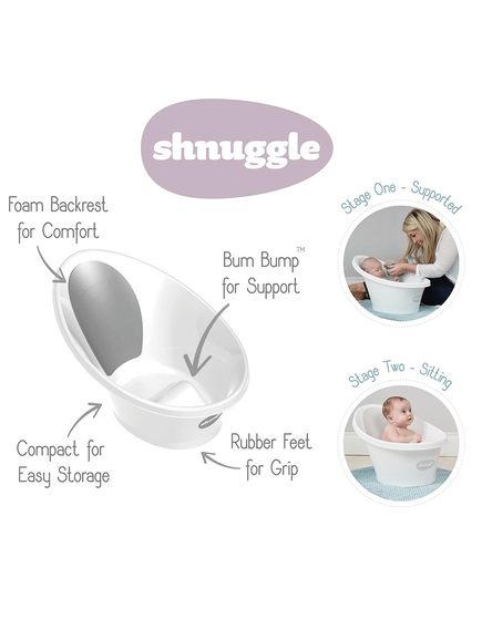 Shnuggle е внимателно проектиран, за да създаде сигурно и защитено място за къпане на Вашето бебе, което го прави по-удобно и приятно за бебчо и по-малко стресиращо за Вас - родителите.