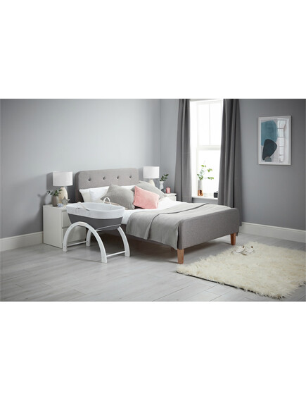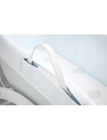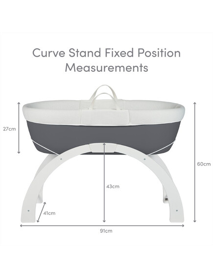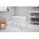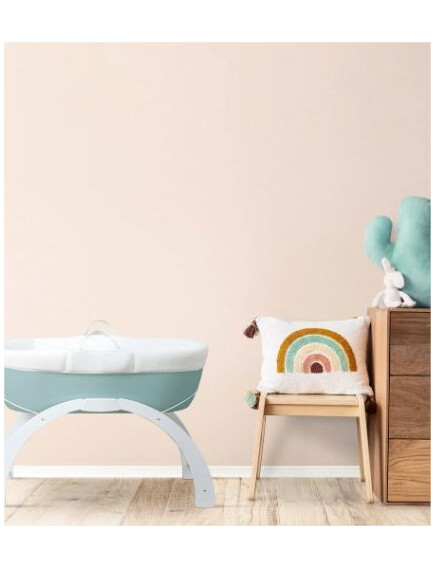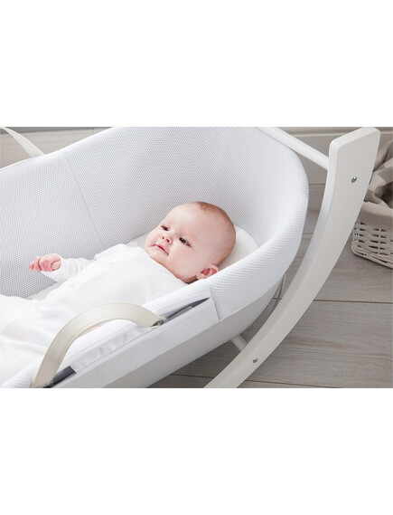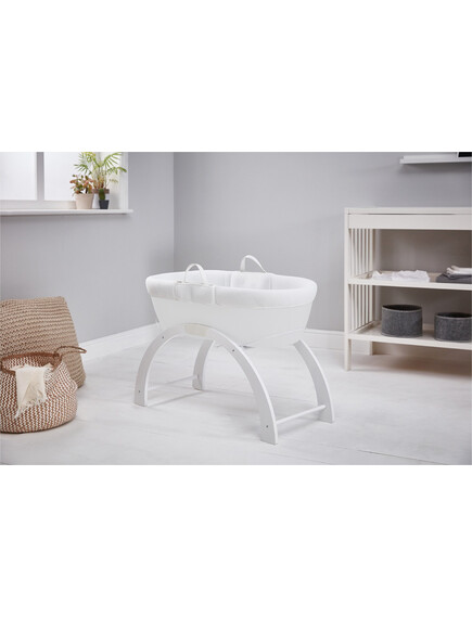 • Включен в комплекта на кошницата е луксозен ватиран матрак и бяла дървена стойка с две позиции: люлка на ниско ниво или фиксирана позиция на високо ниво.