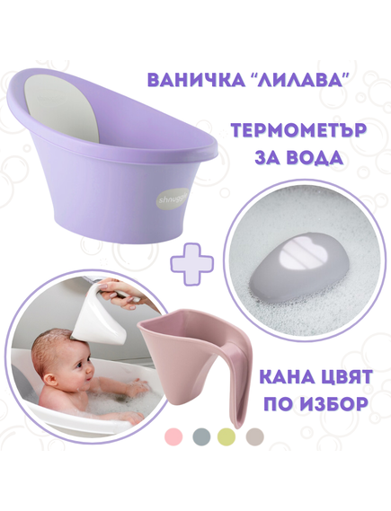 Shnuggle КОМБО "Първият Сет за Баня Лилав": Бебешка Вана + Термометър Pebbly + Kана за къпане Washy в цвят по избор