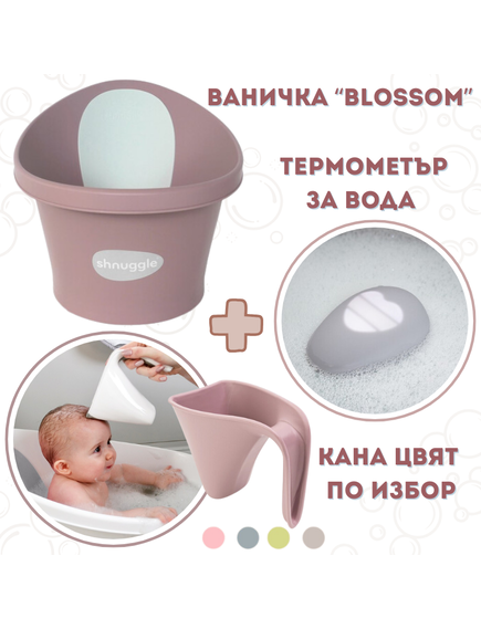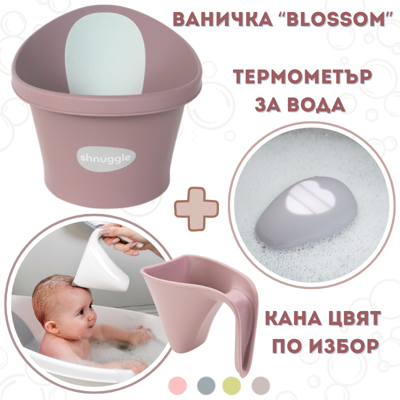Shnuggle КОМБО "Първият Сет за Баня Розов": Бебешка Вана + Термометър Pebbly + Kана за къпане Washy в цвят по избор