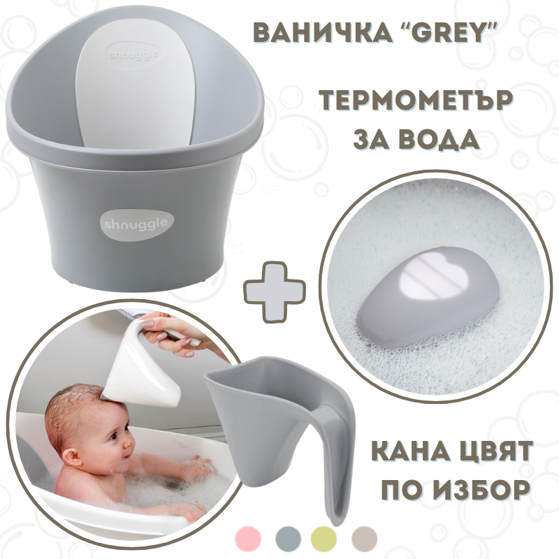 Shnuggle КОМБО "Първият Сет за Баня Сив": Бебешка Вана + Термометър Pebbly + Kана за къпане Washy в цвят по избор