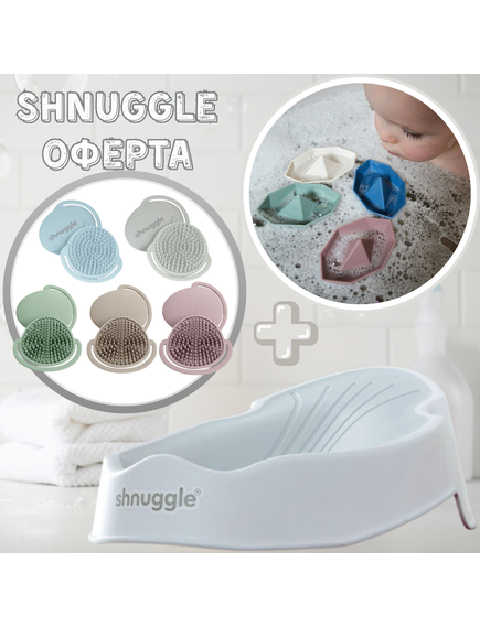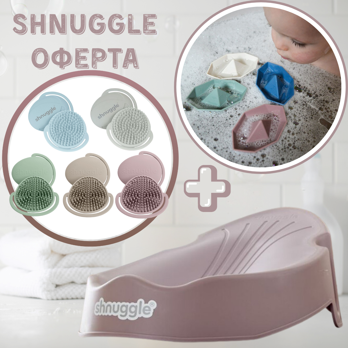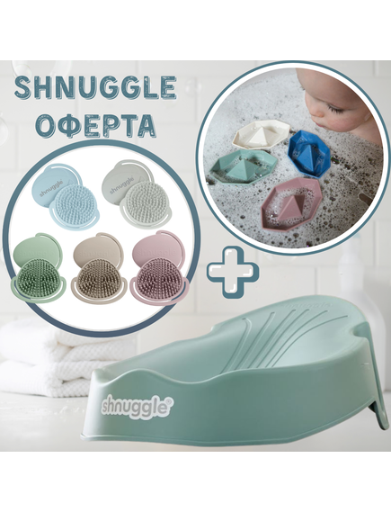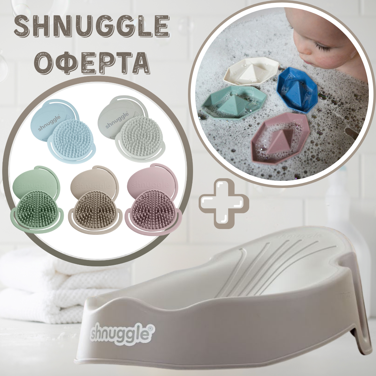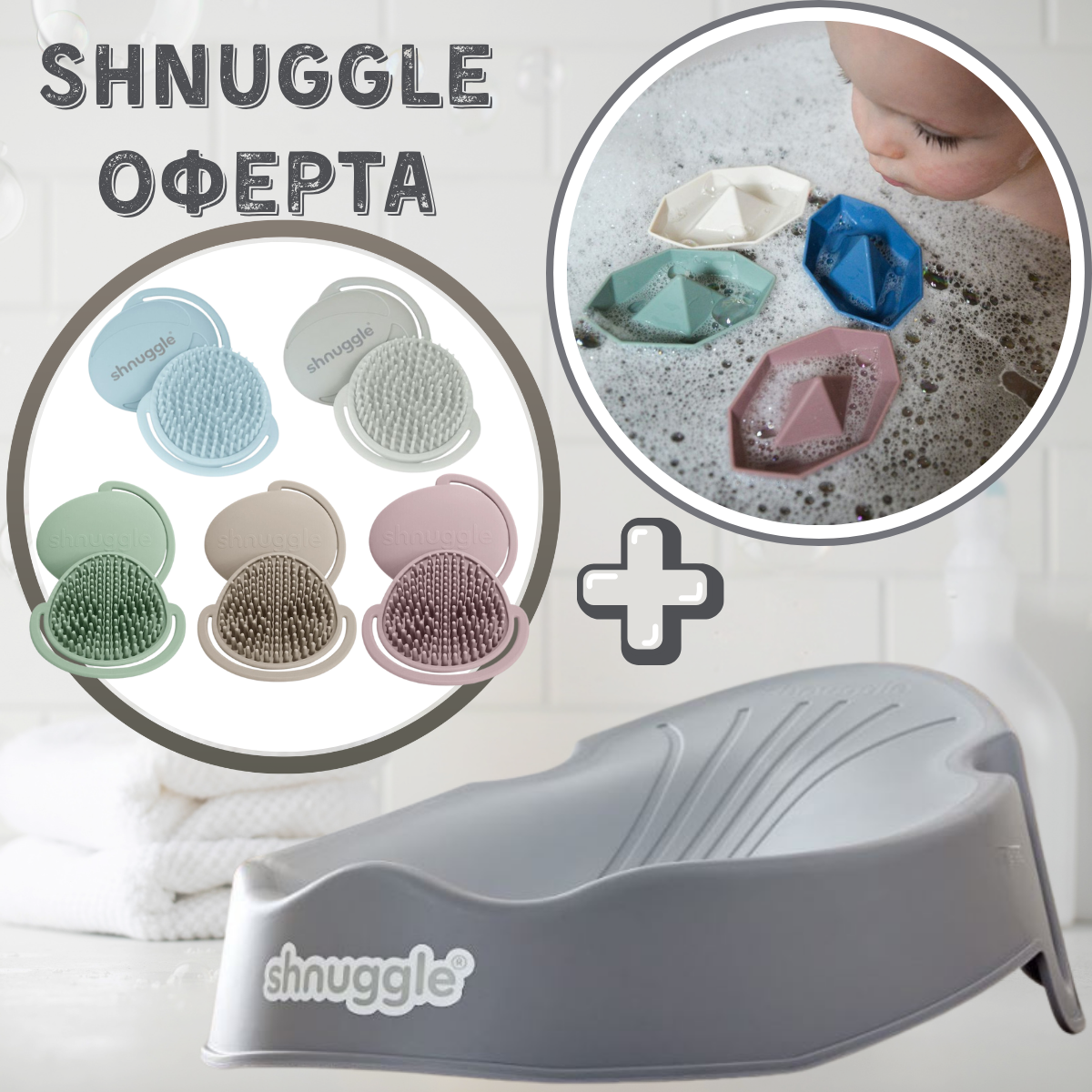 Shnuggle Оферта: "Нужните аксесоари за бебешка баня": Нехлъзгаща се подложка за къпане + Антибактериална четка + Силиконови лодки