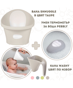 Shnuggle – спокойствие, сигурност и комфорт за първите бани на бебчо у дома! Създайте спокойни и щастливи моменти по време на баня с   "Първият сет за баня" на  Shnuggle! Той включва трите най-популярни и награждавани продукта на марката: бебешка вана Shnuggle Bath ,...