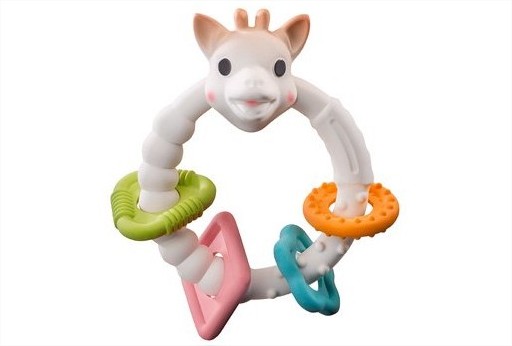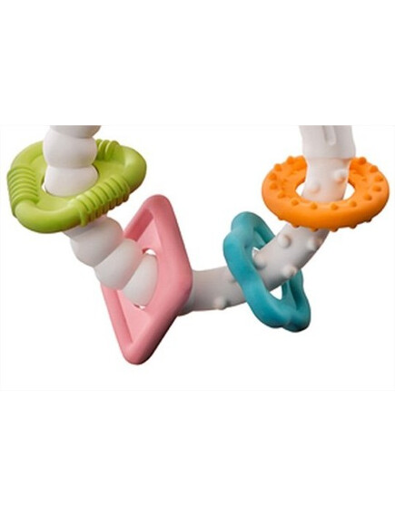 Направена е от 100% естествен каучук! Всички части са меки, за да може да се гризкат лесно и имат различни текстури за по-добър масаж на венците и по-ефективно облекчение на дискомфорта причинен от никнещи зъбки.