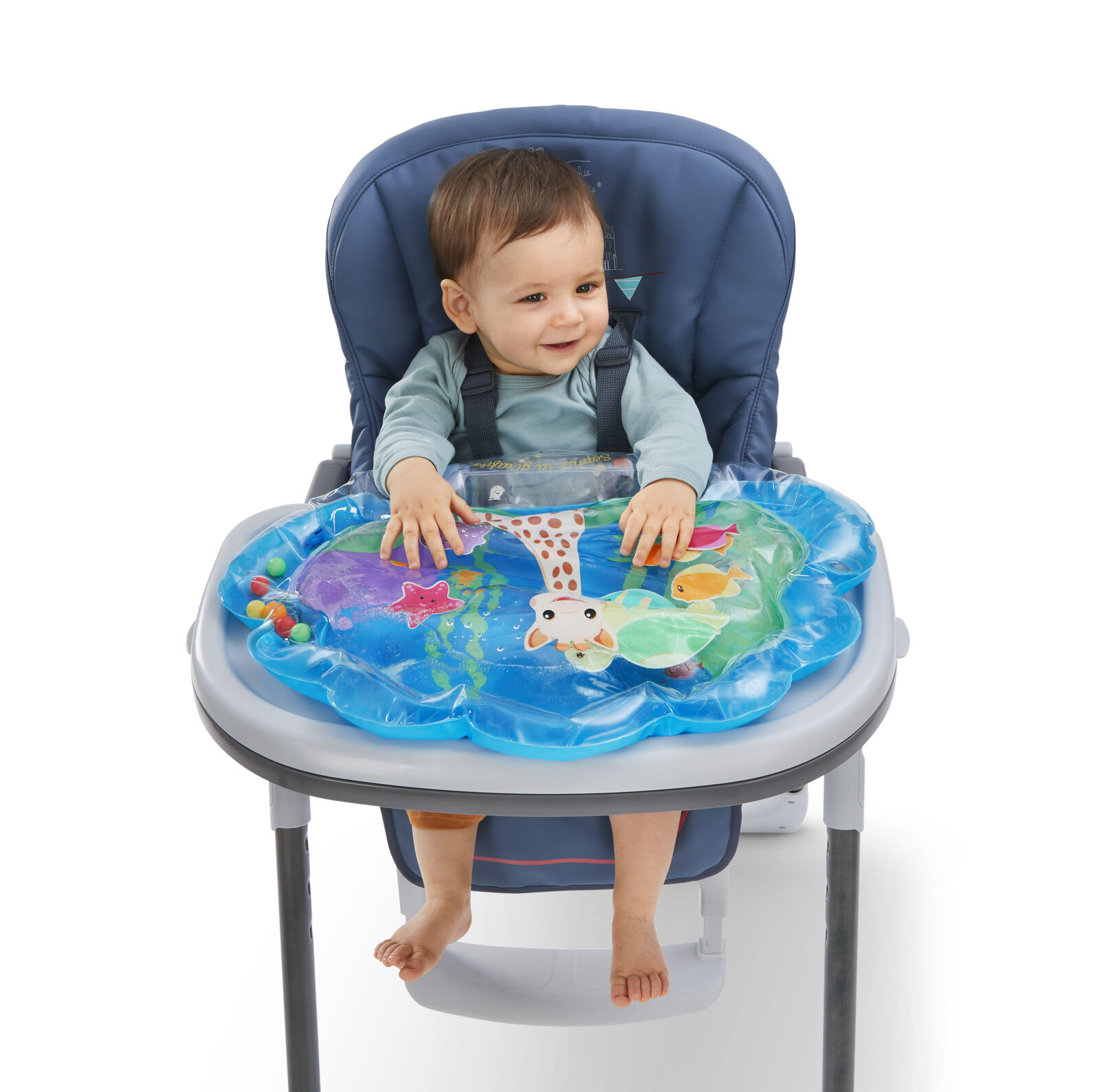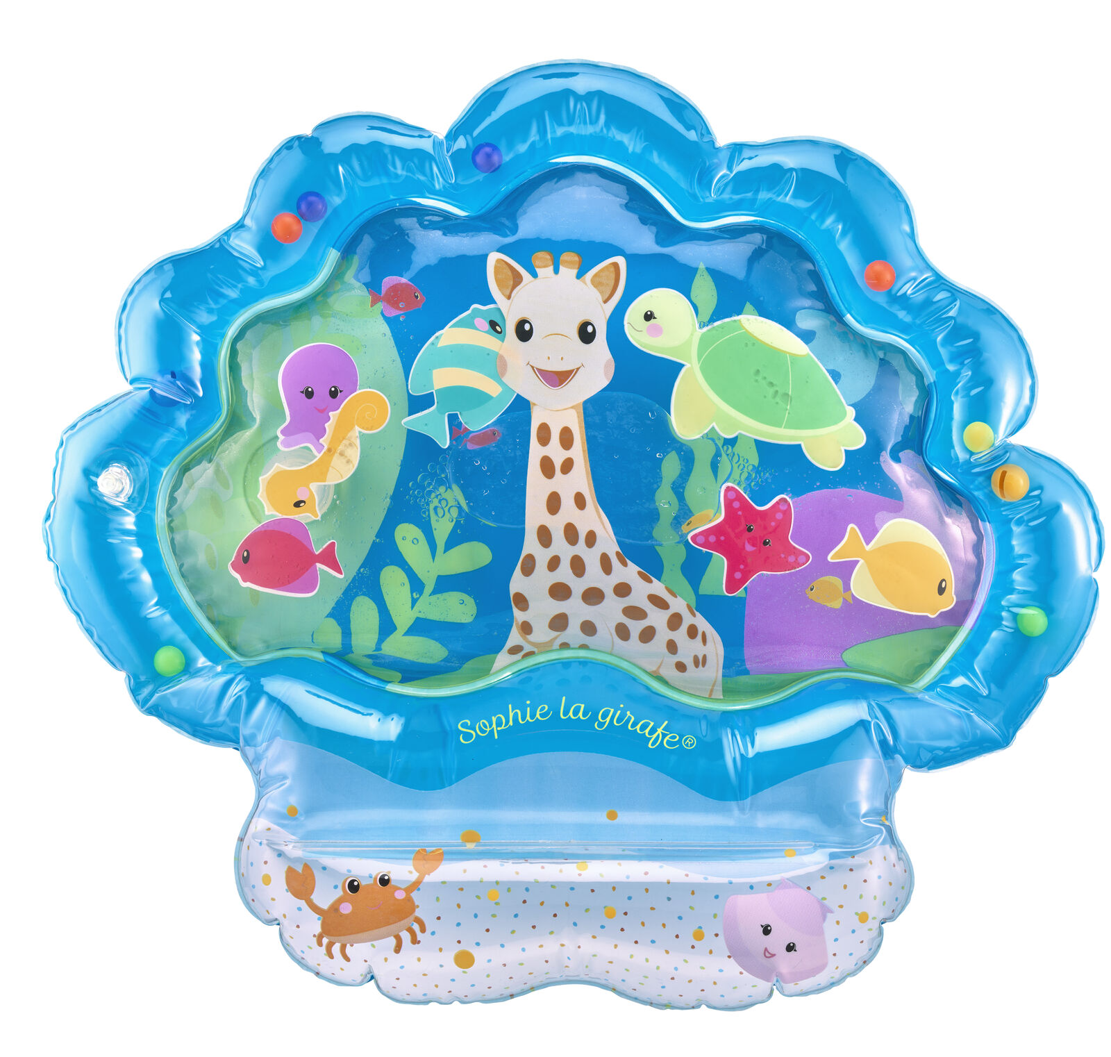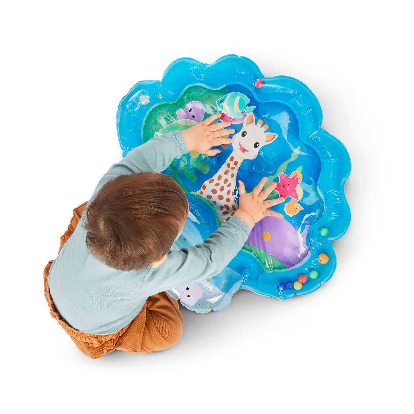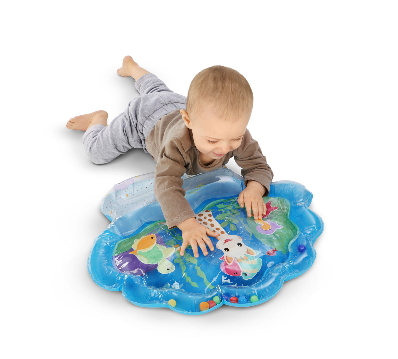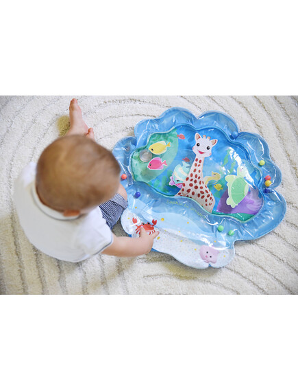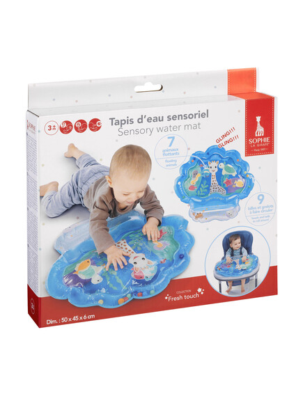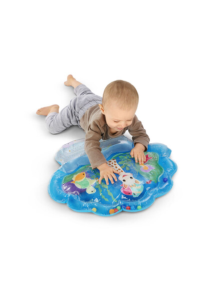 Когато бебето натисне центъра на килима, водата се движи, а 7-те плаващи животинки се движат с „течението“. Така детето открива причина-следствие и експериментира с допир.