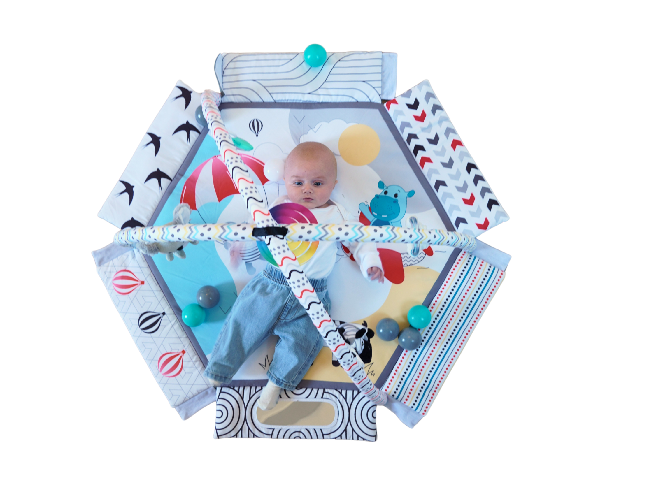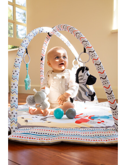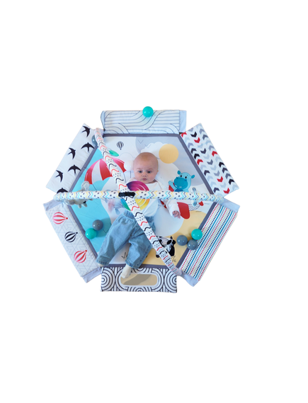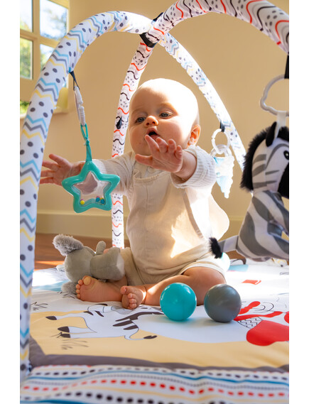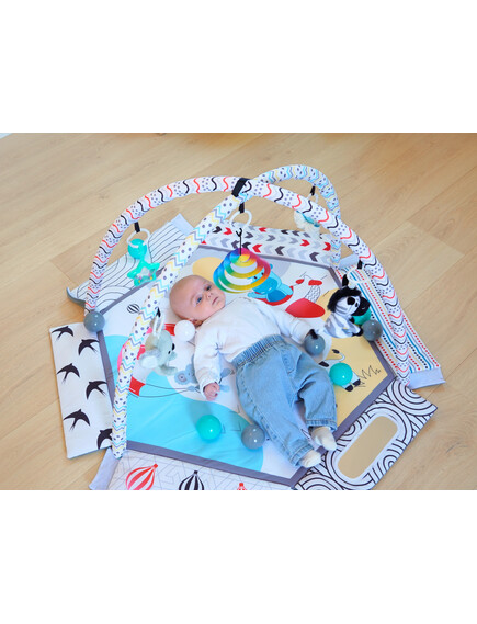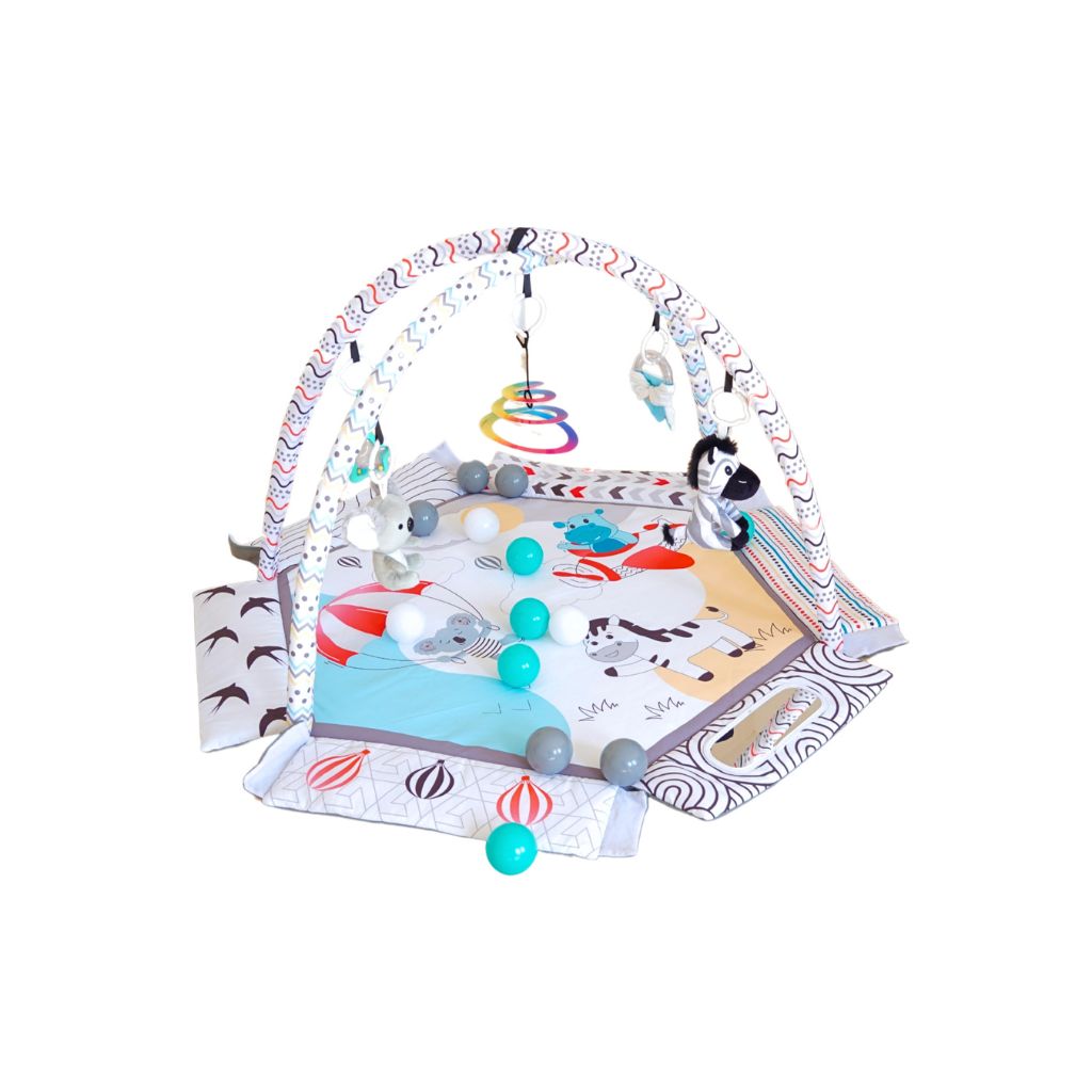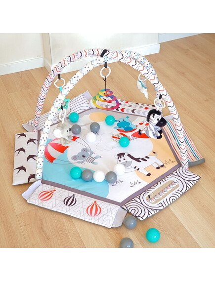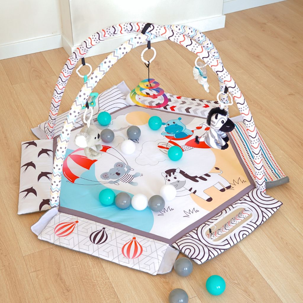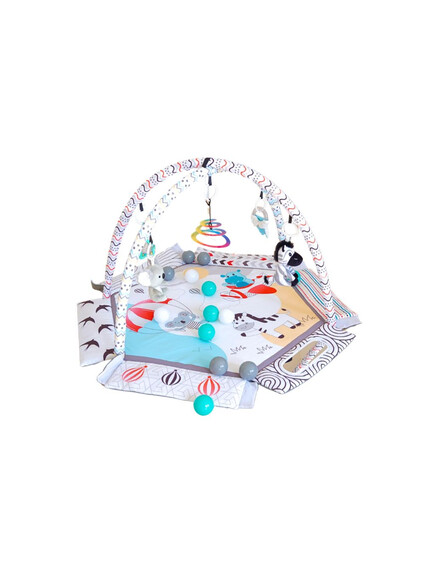 С мек и безопасен дизайн, красиви цветове и 30 цветни топки, вашето бебе ще се забавлява, ще се движи и ще развива уменията си чрез игра. Гимнастиката лесно се трансформира в басейн с топки или в занимателен активити килим.