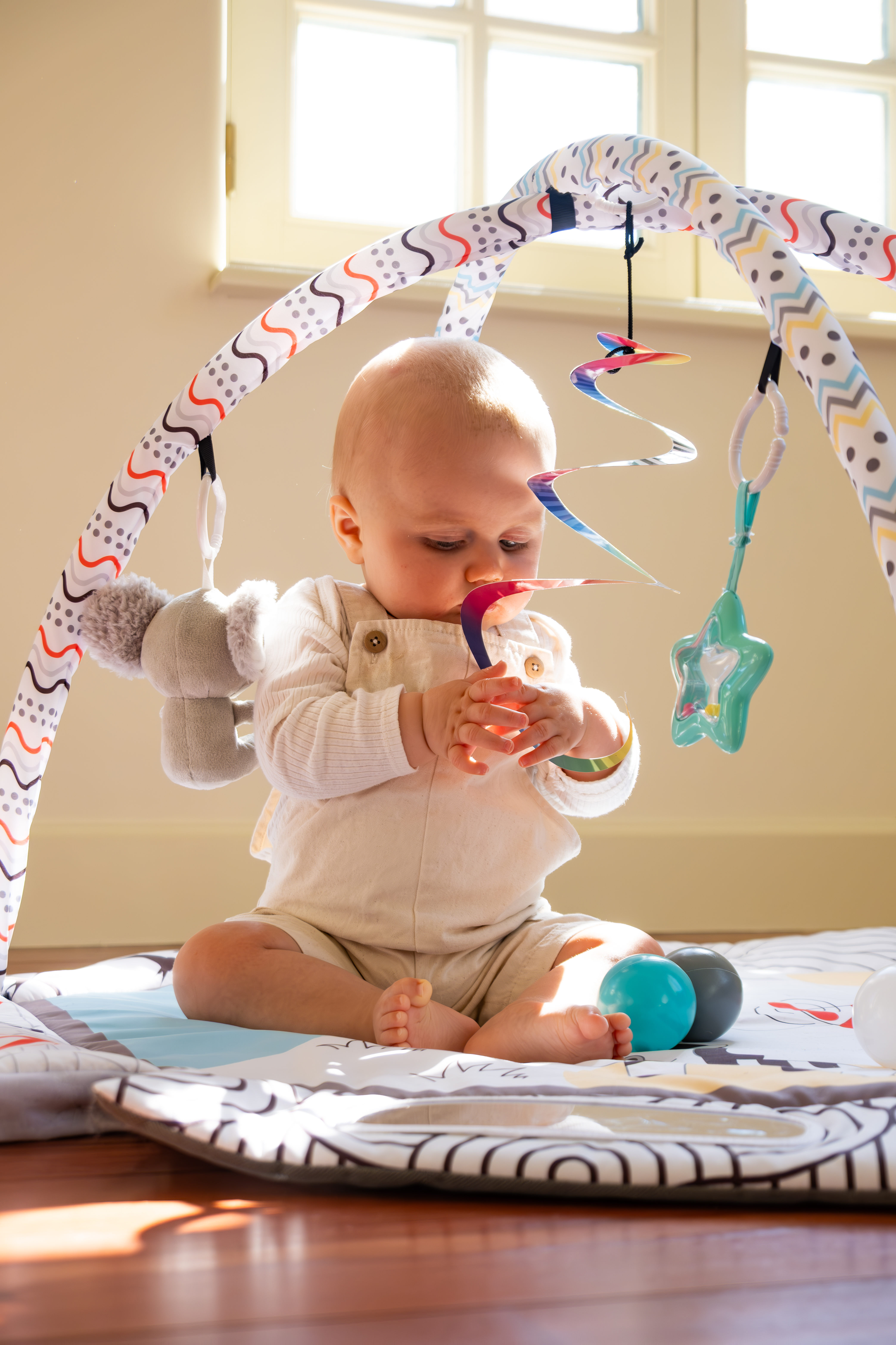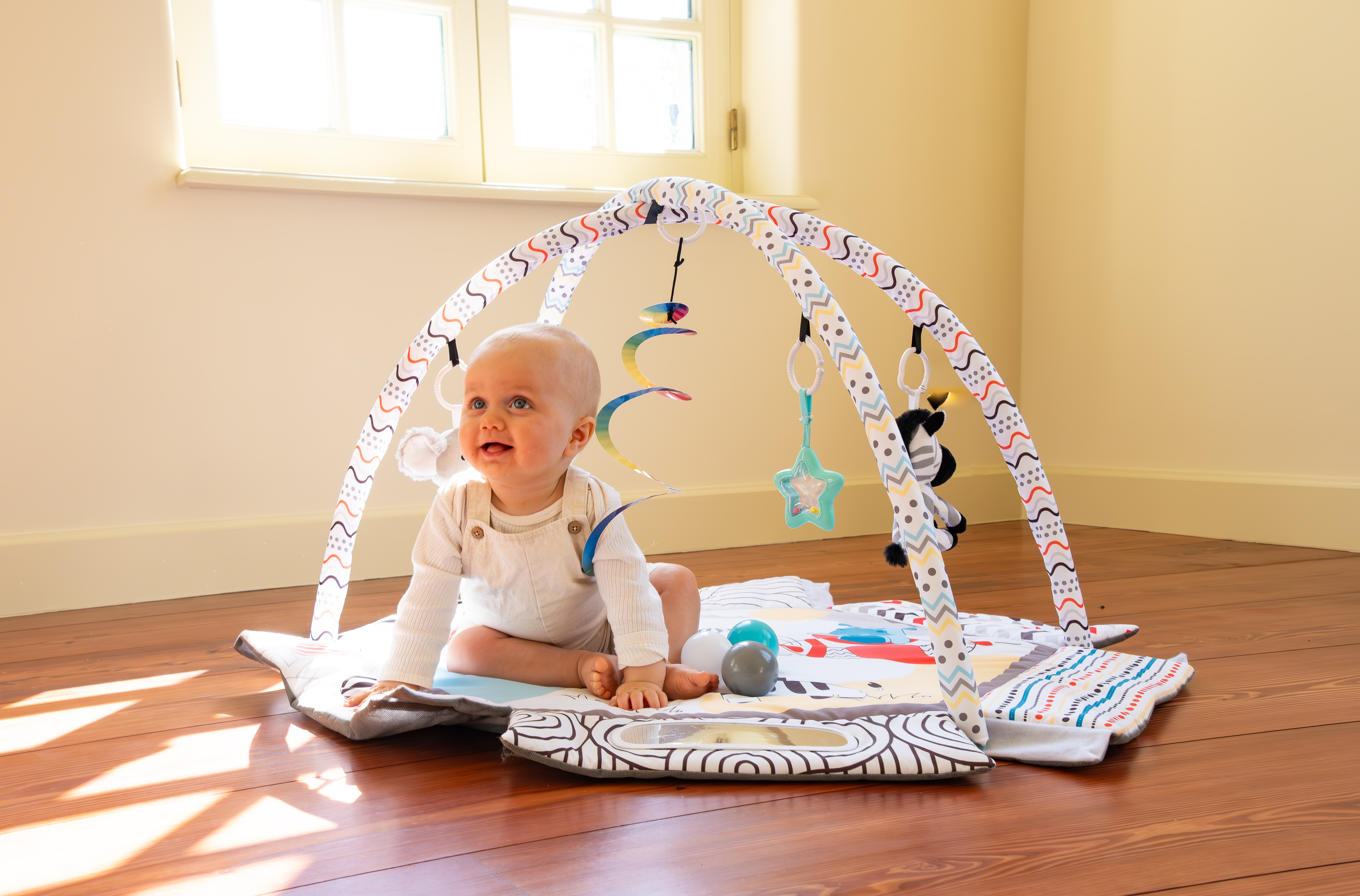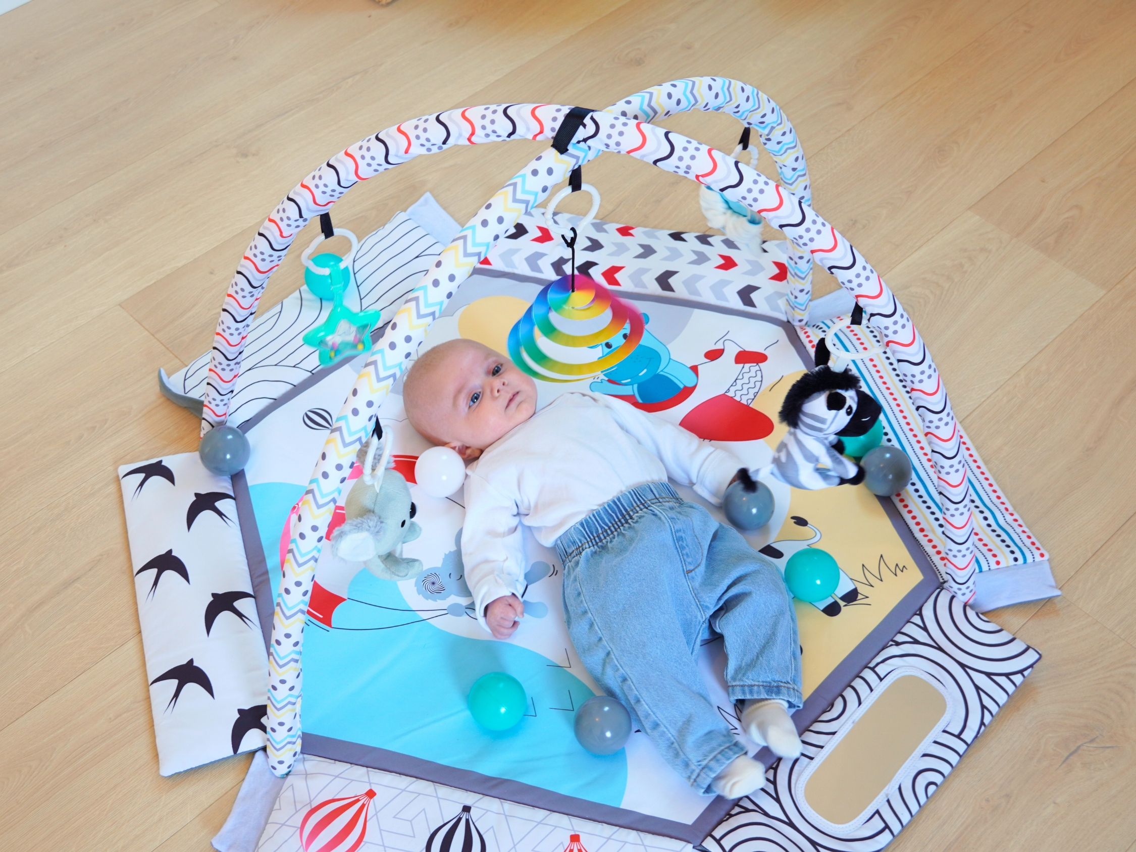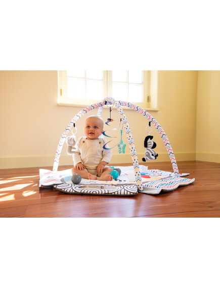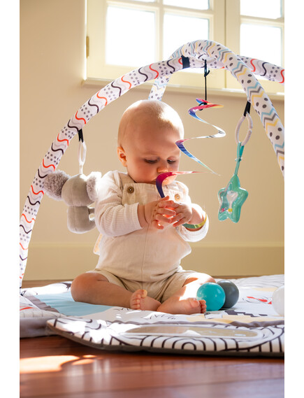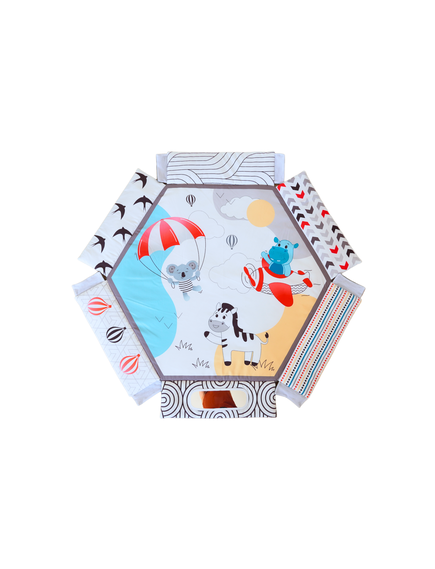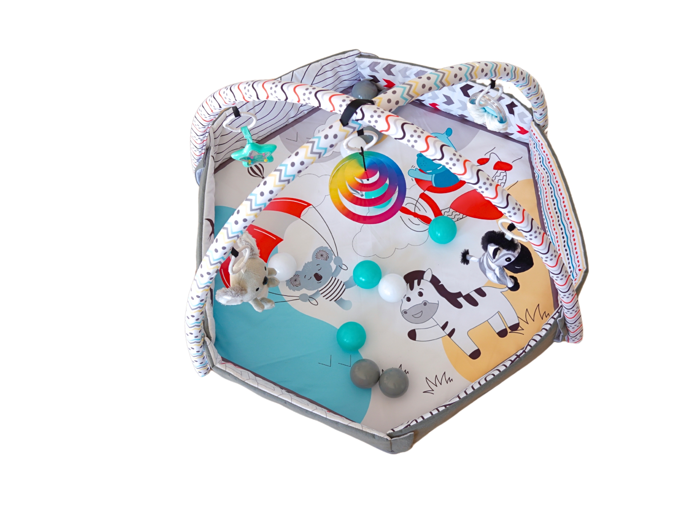 С мек и безопасен дизайн, красиви цветове и 30 цветни топки, вашето бебе ще се забавлява, ще се движи и ще развива уменията си чрез игра. Гимнастиката лесно се трансформира в басейн с топки или в занимателен активити килим.