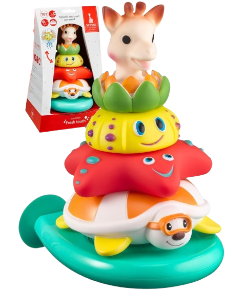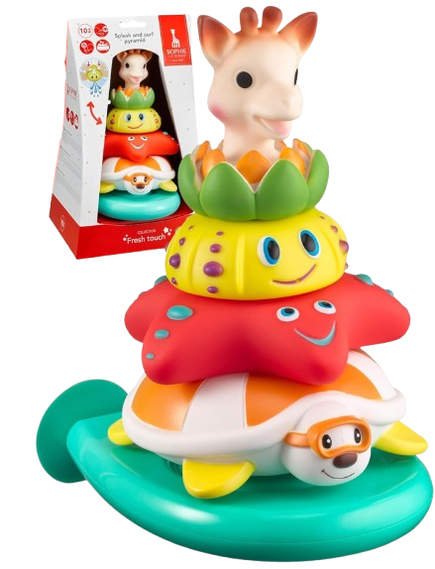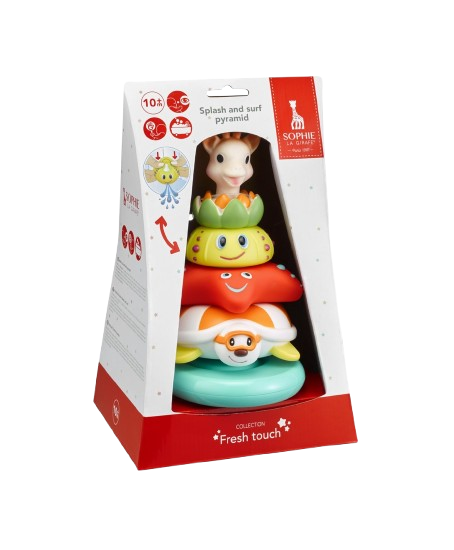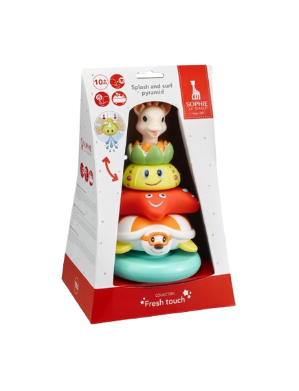 Със Splash and Surf Pyramid от Sophie la girafe превръщате времето за баня в уникален и специален момент за вашето дете, като насърчавате неговото развитие и любопитство по забавен начин.