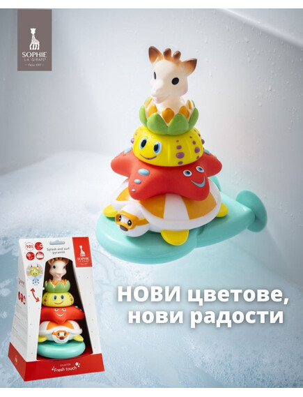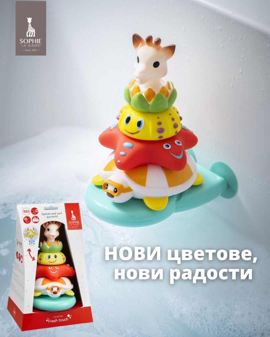 Пирамидата за баня Splash and Surf Pyramid на Sophie la girafe е идеалната играчка, която превръща времето за къпане в забавление и учене за вашето бебе.