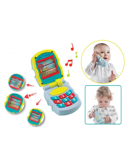 - Музикален телефон с много функции и нови приятели- мишлето Жозефин, мечето Габин и Софи се появяват един след един на екрана на телефона! Цветове, които се променят в зависимост от мелодията. 5 мелодии, които бебето да слуша с удоволствие. Забавни звуци при натискане на бутоните! Работи с 2 батерии AAA / LR3.