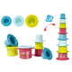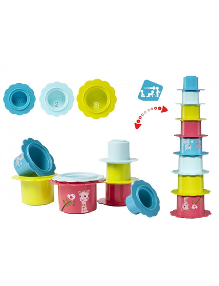 - 8 цветни чаши в различни цветове, които предлагат много различни дейности за развитието на детето. Първо, бебето може да се справи и да открие животните, отпечатани на чашите. След това той може да ги напълни с вода, за да научи връзката между "празно / пълно" и "леко / тежко". Бебетата обожават да сглобяват и разглобяват. Тези прекрасни цветя ще задържат вниманието им с часове. Детето ви ще реди високи кули, ще си измисля различни истории и ще се забавлява безкрайно.