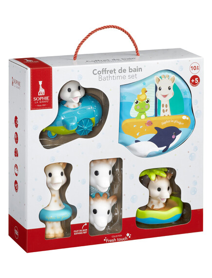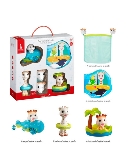 - Книга за баня Софи жирафчето: книга от 8 страници, за да откриете Софи и нейните приятели, докато се наслаждавате на водата.