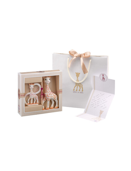 Този красив сет съдържа любимата Софи направена от 100% естествен каучук, която е безопасна, натурална играчка за гризане. Подходяща е за бебета от 0+ месечни бебета! Комплекта съдържа и още една гризалка идеална за облекчение на раздразнените венци. Двата ринга имат различна текстура, за да може бебето само да прецени, коя му е по-удобна според нуждите и възрастта си и да може максимално да се наслади на облекчението в болезнени венци.