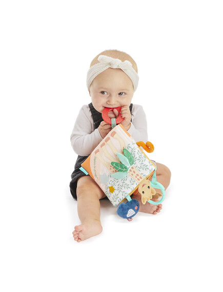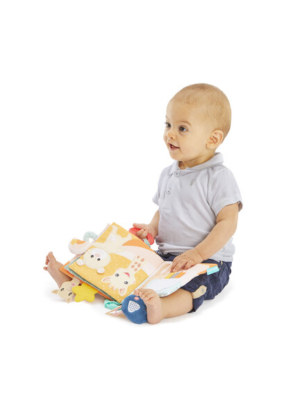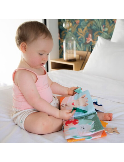 Книжка от плат, пълна със занимания и изненади, които ще стимулират сетивата на бебето и ще "събудят" любопитството му!