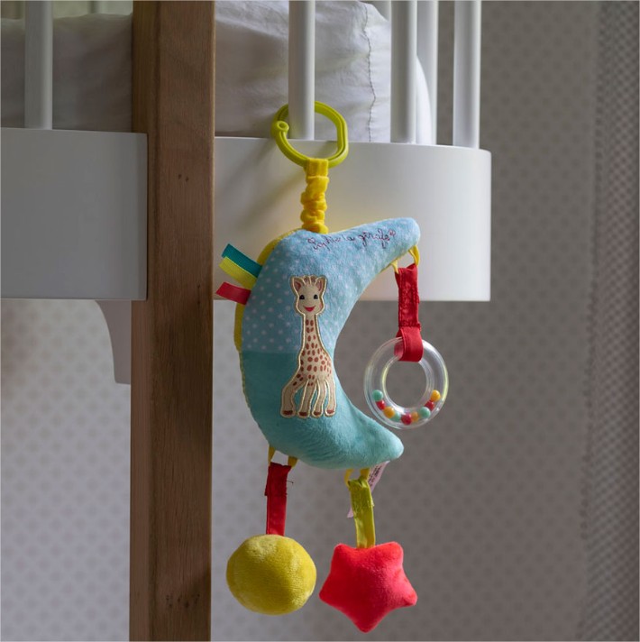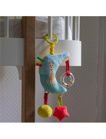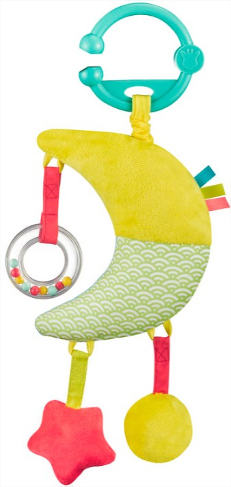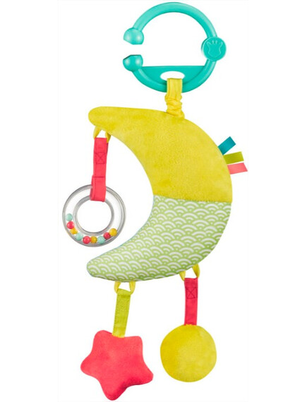 Дръпнете връвчицата и луничката ще тананика нежна мелодия, която ще успокоява вашето бебе. Луната лесно може да се прикрепи към леглото, кошарата за игра, количката или столчето, благодарение на кукичка.