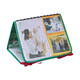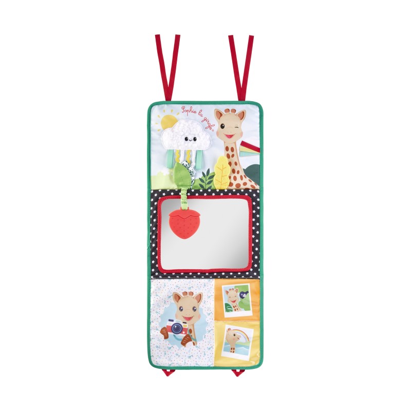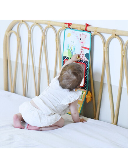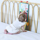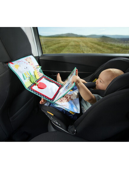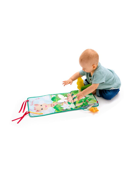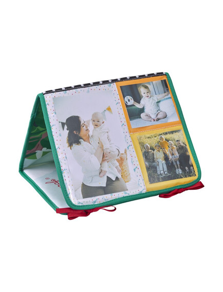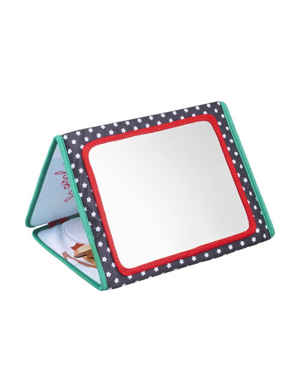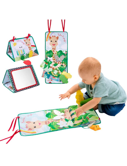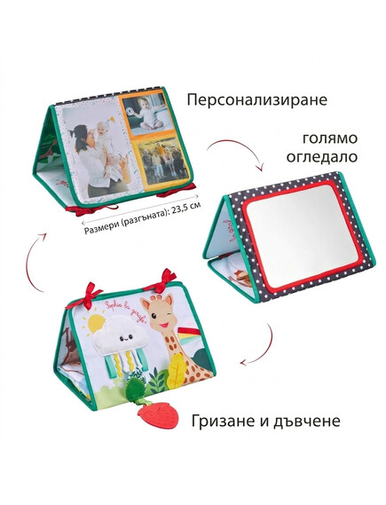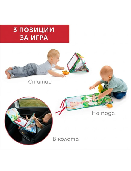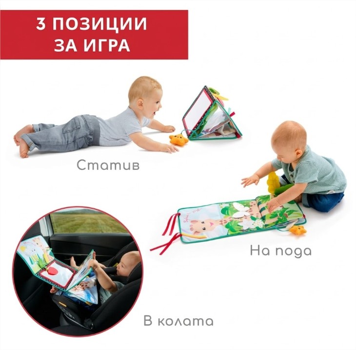 - Позиция „Статив“: Книжката предлага 3 страни за събуждане на сетивата на бебето. Има голямо огледало за откриване на собственото отражение, страна за персонализиране със снимки и цветна, текстурирана страна с етикети, листенца за хващане и дори гризалка за дъвчене!