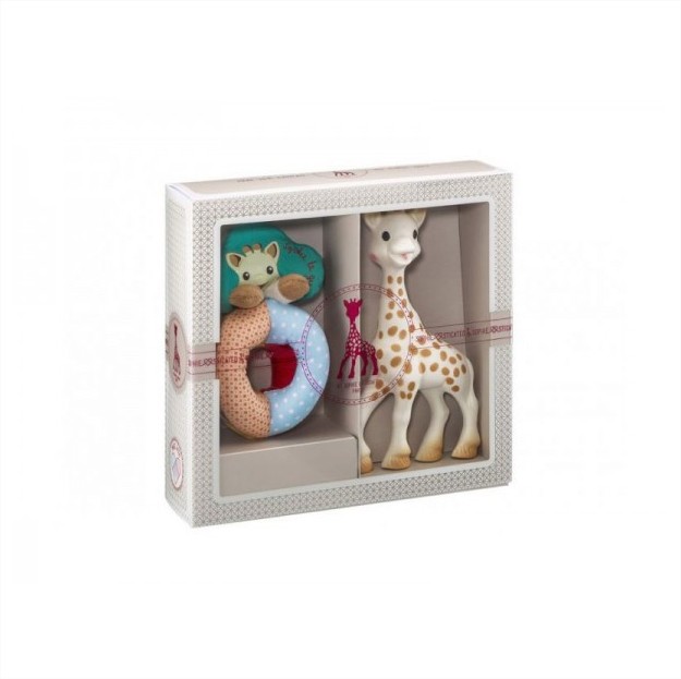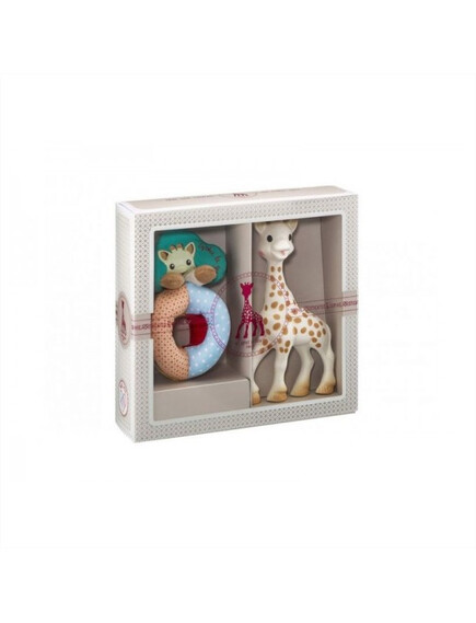 Този красив подаръчен комплект включва любимата ни Софи, изработена от 100% естествен каучук и мека дрънкалка с шарени мъниста, която да забавлява бебето. Ярките цветове и дизайна й привличат вниманието му, докато различните текстури и цветни топчета провокират у бебето любопитство и желание за преоткриване. Това е идеалната първа дрънкалка за него, защото е лека, мека и лесна за хващане.