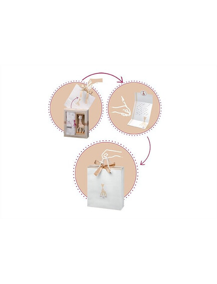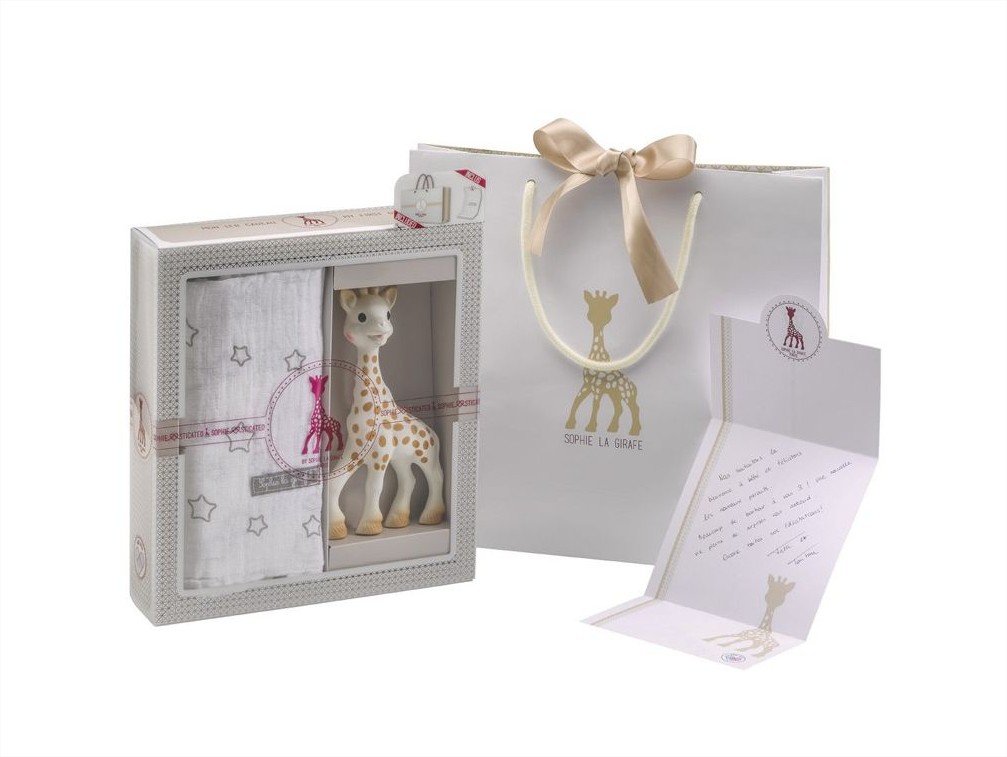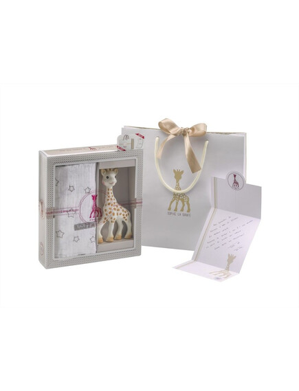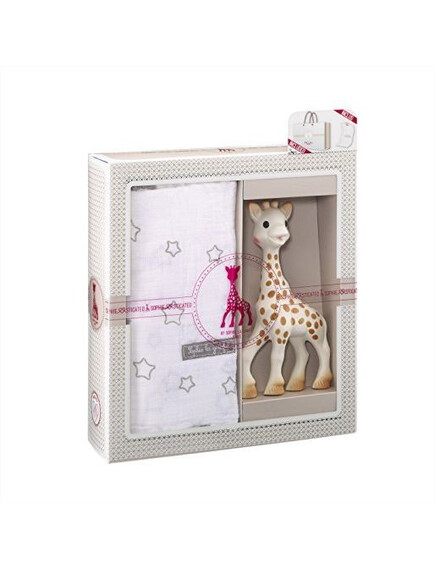 Този красив подаръчен сет включва любимата Софи, направена от 100% естествен каучук, напълно натурална и безопасна играчка за бебета и пелена с размер 120 Х 120см, която може да се използва като одеяло за покриване, за смяна на памперси, лигавник, покривало за количка и мн.др!