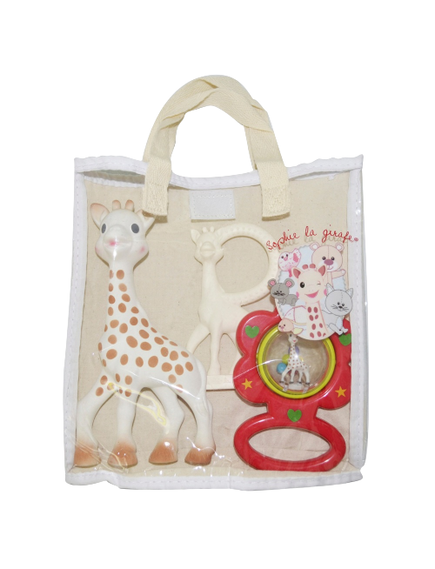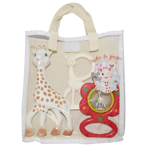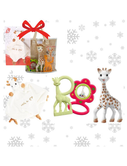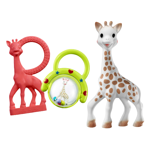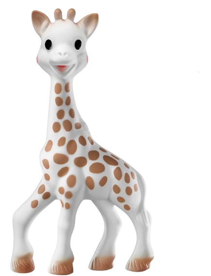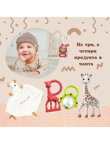 - Автентичното жирафче Софи, направено от 100% естествен каучук, което стимулира всички сетива и е перфектно за периода на никнещи зъбки